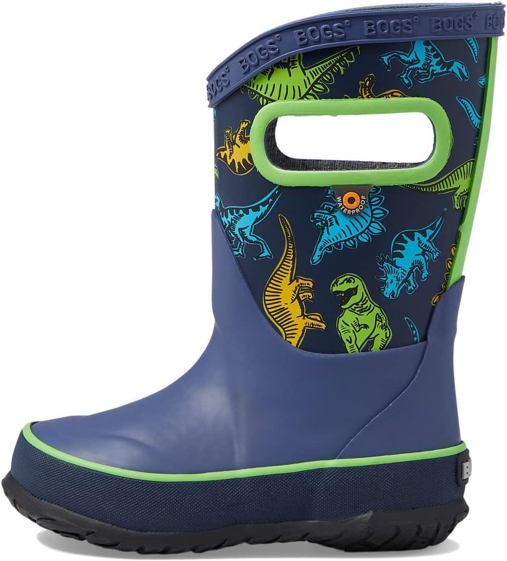 Let your little one enjoy the weather by opting for the Bogs Kids Rain Boot Super Dino Rain boots. 100% Waterproof. DuraFresh natural bio-technology activates to fight odors. Bogs Max-Wick evaporates sweat to keep feet dry. Crafted with ultra-soft and flexible rubber. Lightweight construction. BLOOM ethylene vinyl acetate footbed. Easy on handles. Synthetic upper. Textile lining and removable textile insole. Pull-on style. Eye-catching print on the shaft featuring super dino. Pull handles for easy wear and removal. Signature brand name heel label. Round toe silhouette. Synthetic outsole with added traction. Imported.