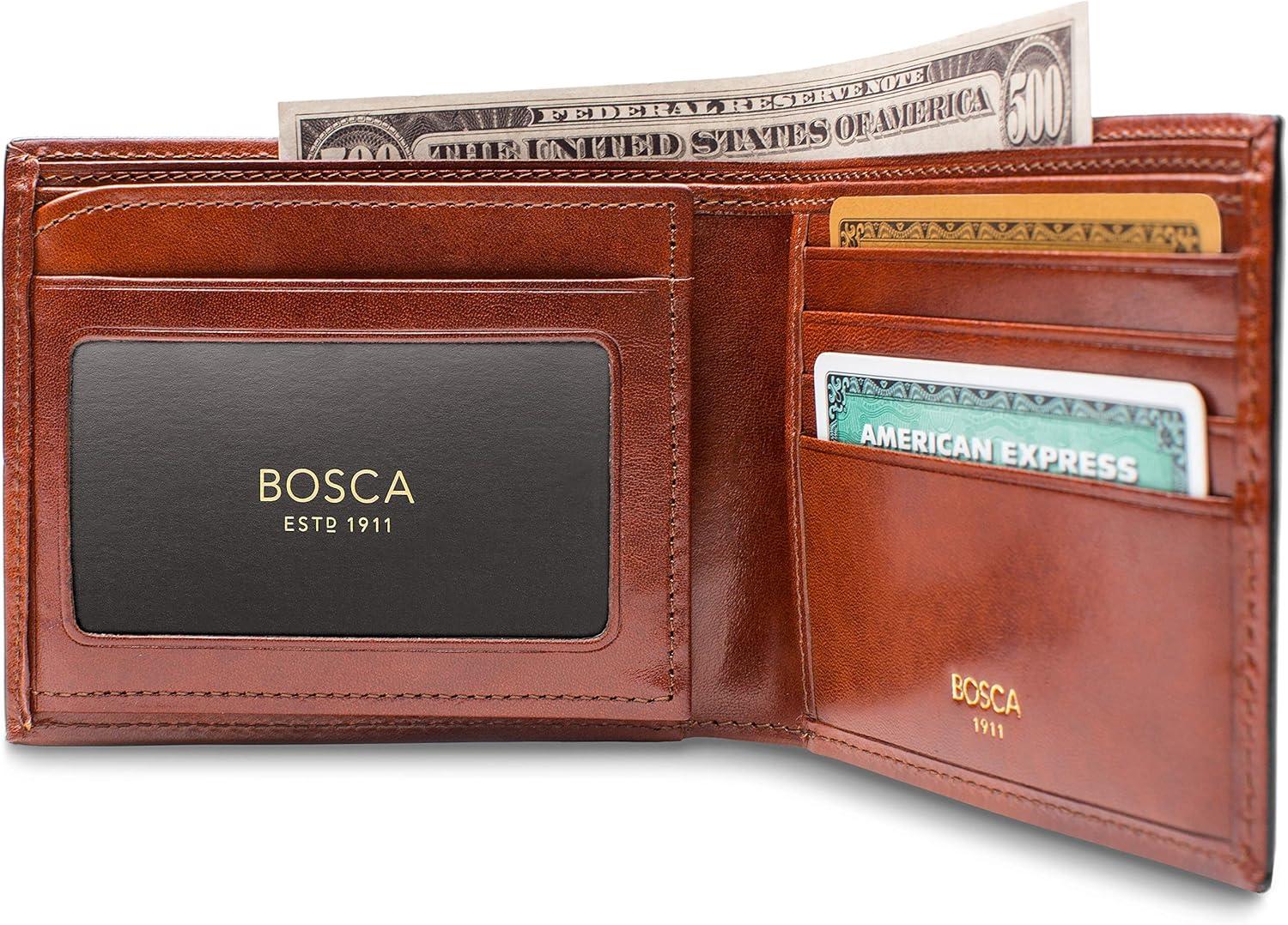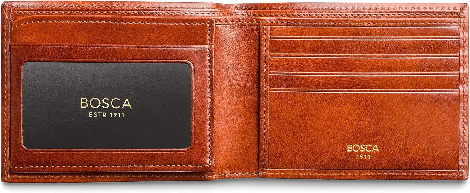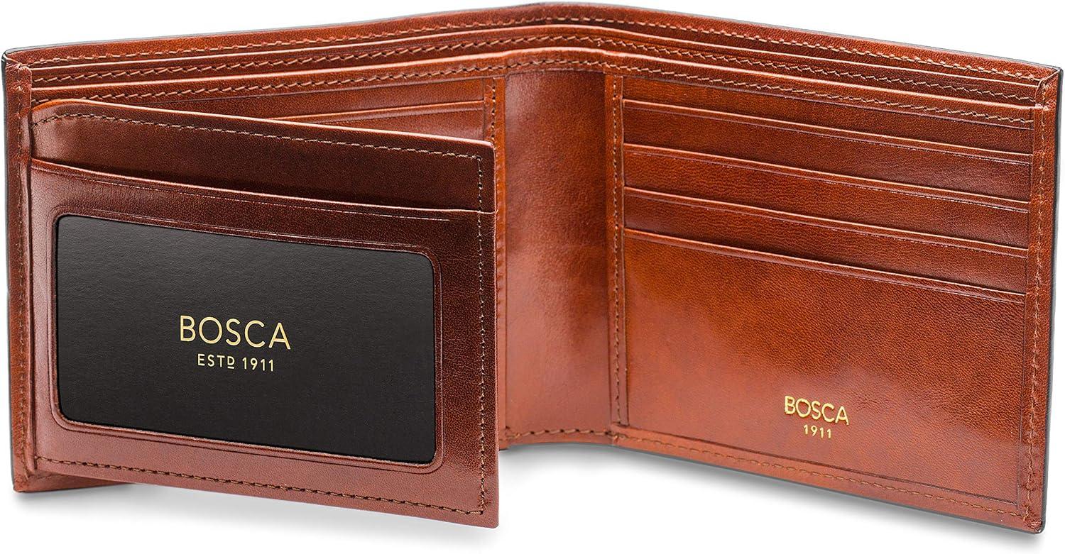 Bosca Men’s Old Leather Bifold Wallet with ID Window and Card Slots – Italian Leather, Durable and Stylish, Black(Amber)