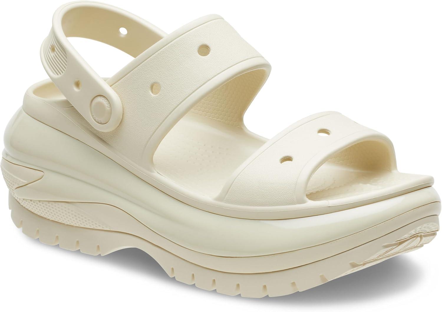 The look and feel of our Classic Mega Crush Clog is now available in sandal form. Introducing the Classic Mega Crush Sandal, featuring an enhanced rubber tread, updated detailing around the outsole and a platform ready to take any outfit to the next level. A two-strap upper and secure backstrap help ensure a secure fit, while boasting holes for personalization with Jibbitz. Are you ready for your new crush? EVA upper with geometric cutout details. EVA lining and footbed ensure cushioned comfort. Easy slip-on style. Open round toe silhouette. Brand name engraved on the slingback strap and the heel counter. Treaded EVA outsole for enhanced grip. Imported. Find Your Size: We recommend sizing down (e.g. if you are a 7.5, size down to a 7)
