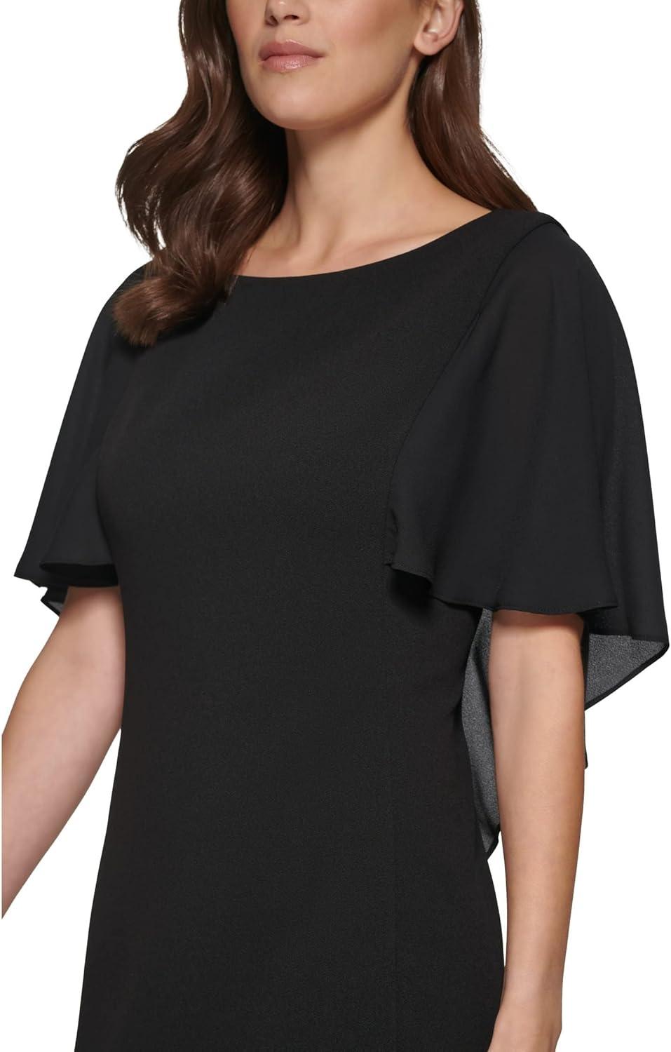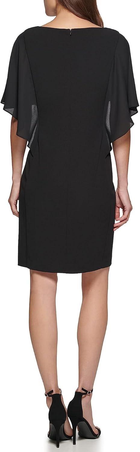 Radiate effortless elegance in the DKNY Chiffon Cape Overlay Dress. Bodice fit. Boat neckline. Short butterfly sleeves. Sheath silhouette. Mini-length. Chiffon cape overlay. Concealed center back zipper. Straight hem. 96% polyester, 4% spandex. Dry-clean. Measurements:Inseam: 35.5 in.