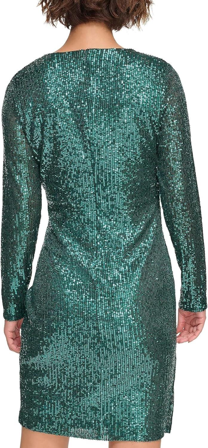 Featuring a sheath silhouette, the DKNY Sequin Side Ruched Dress comes with a long sleeve design. The surplice neckline adds to the look and offers a fresh appeal. Center back zippered closure. 95% polyester, 5% elastane spandex. Dry-clean. Measurements:Inseam: 37″.