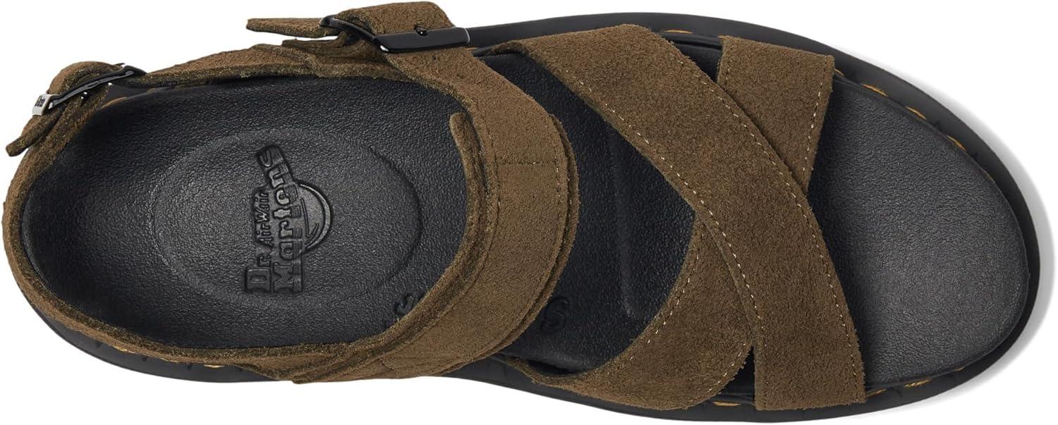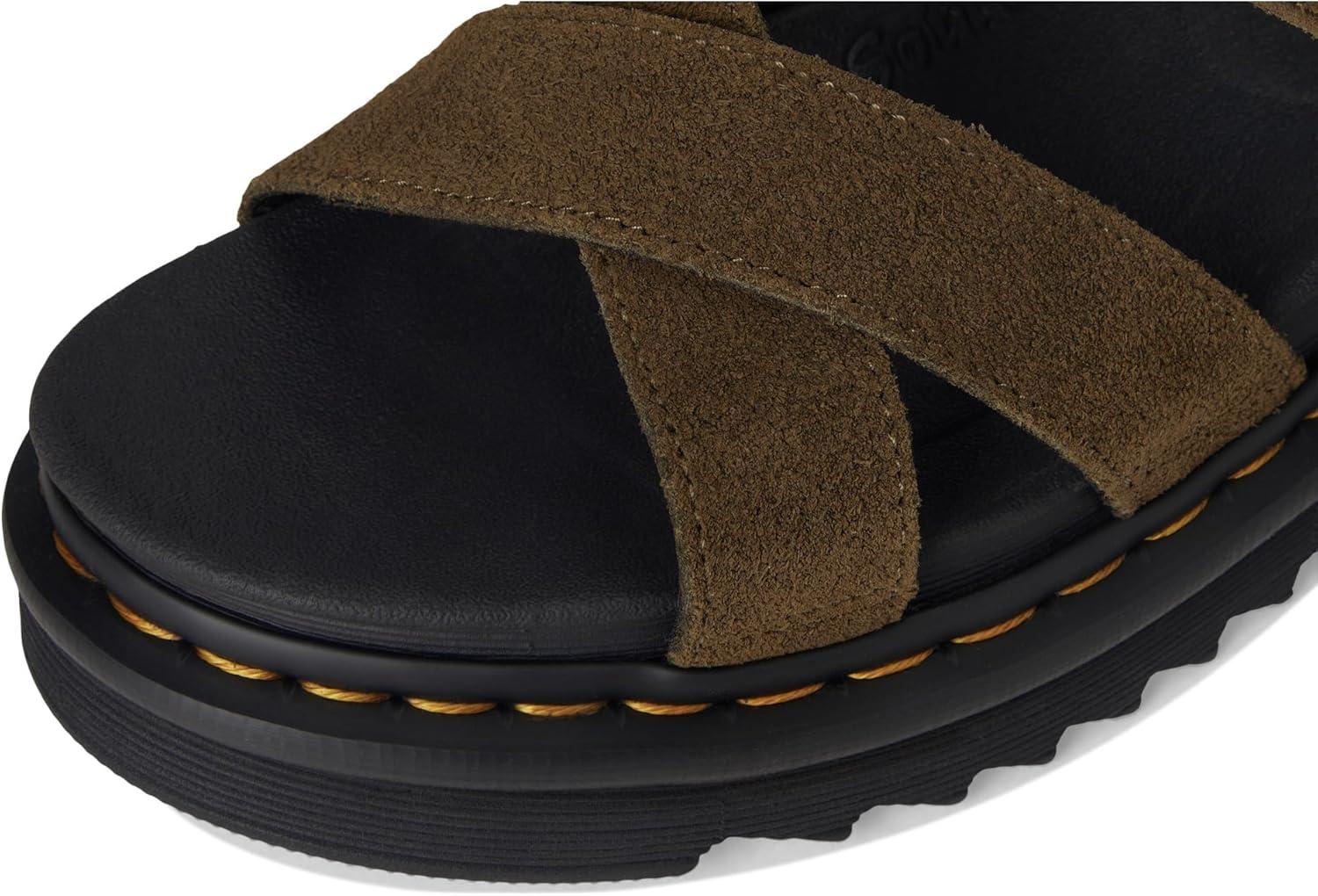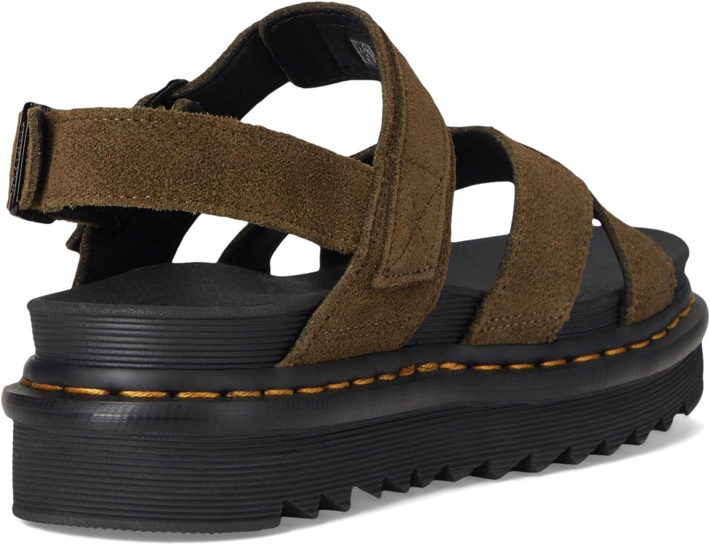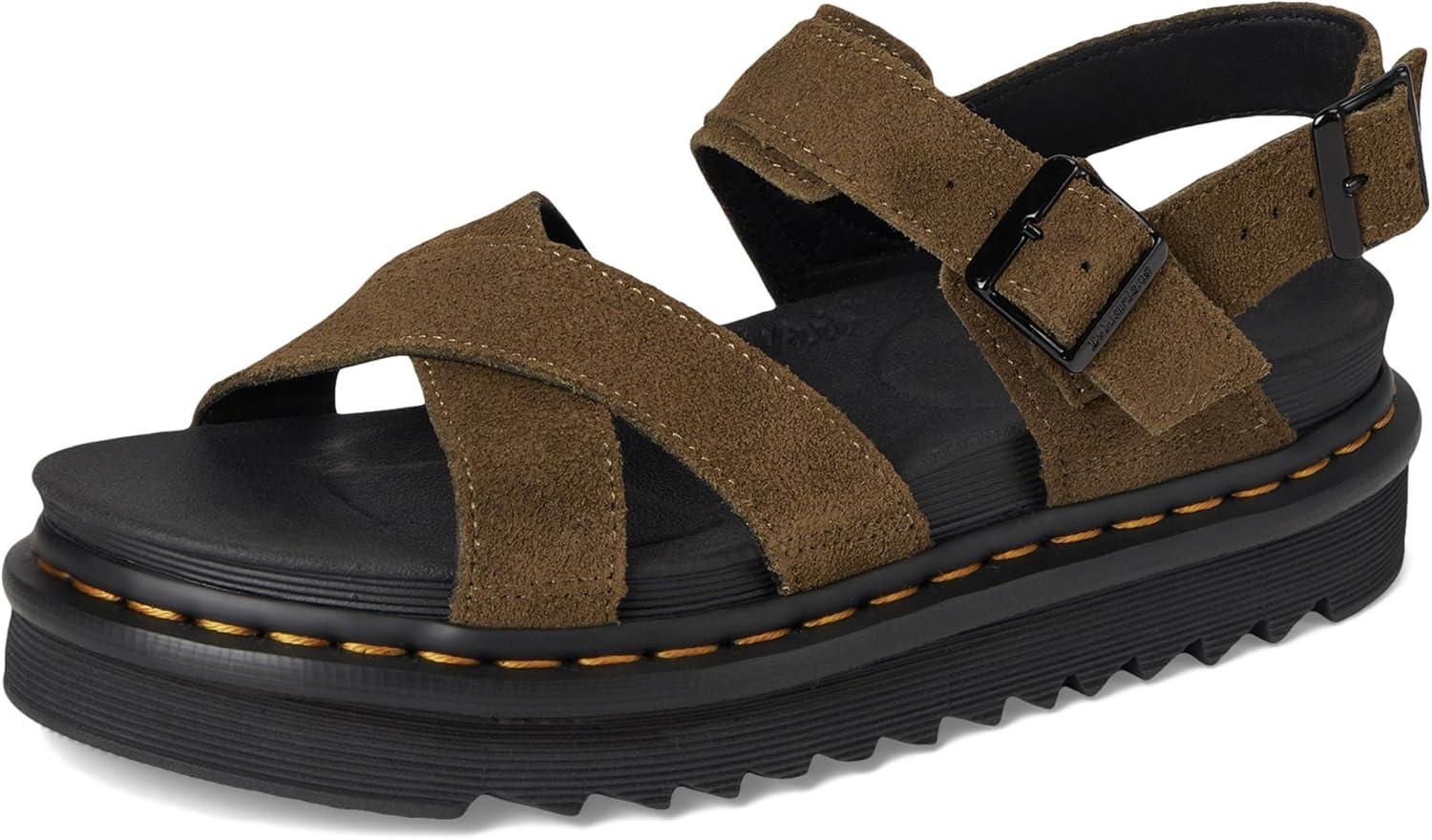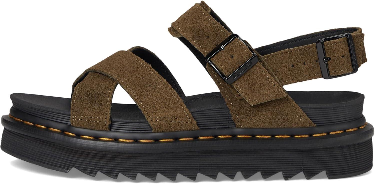 The Dr. Martens Voss II sandal is lightweight and versatile for a summer on the move. The cross-strap design is secured with two adjustable ankle straps. Built for comfort on long days, it has a SoftWair memory foam footbed and a super-light EVA Zebrilus sole. The serrated sole is grooved and secured with DM's unmistakable yellow welt stitching.