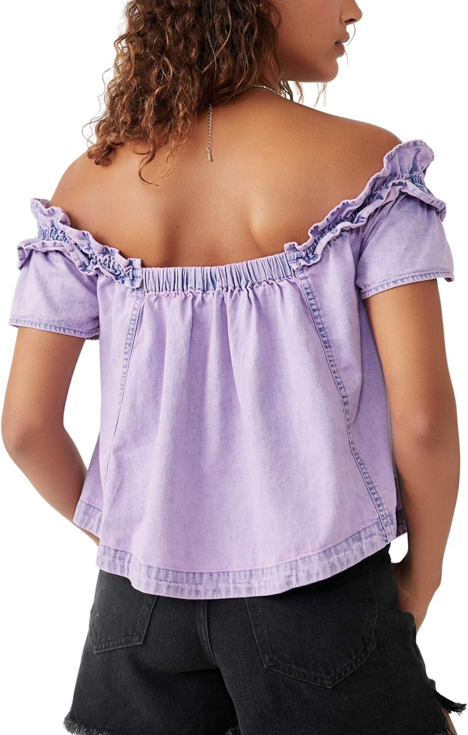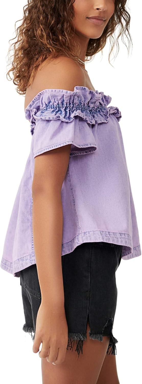 Complete your look with the stylish Free People Maxine Top. Off-the-shoulder ruffled neckline. Off-the-shoulder short sleeves. Denim like inspired design. Straight hemline. 100% cotton. Machine washable.