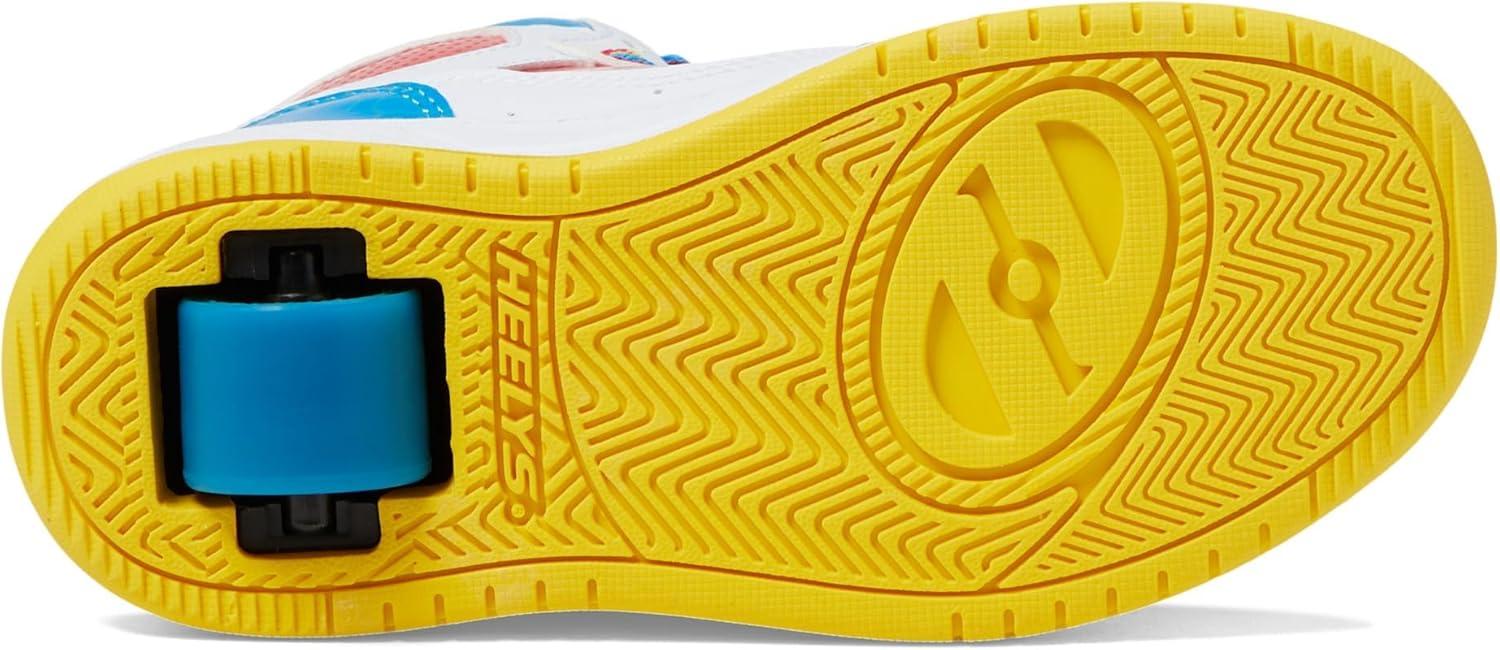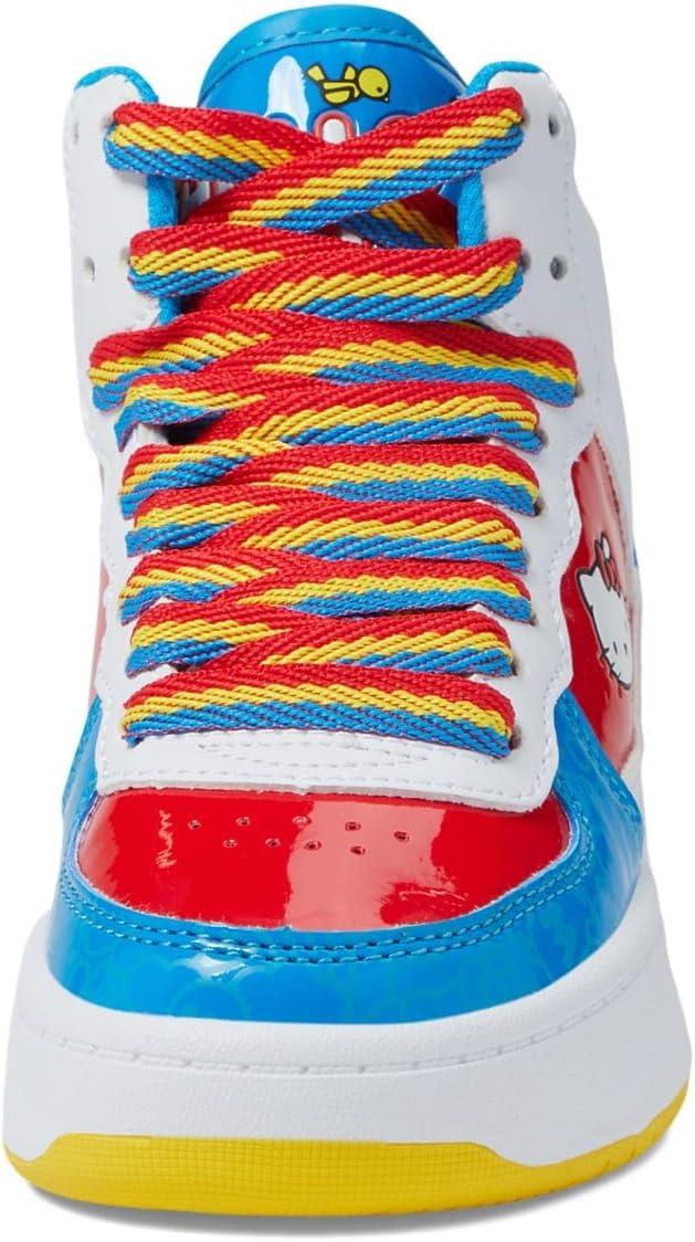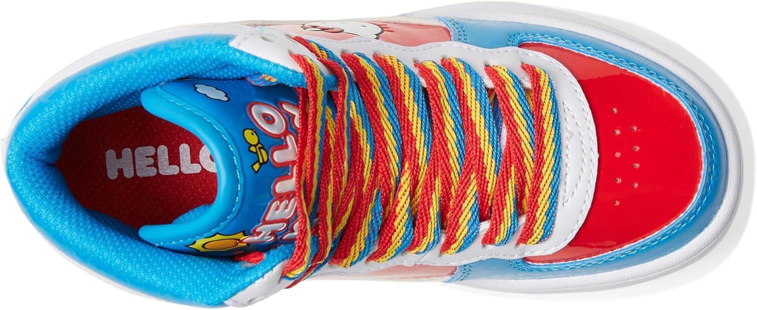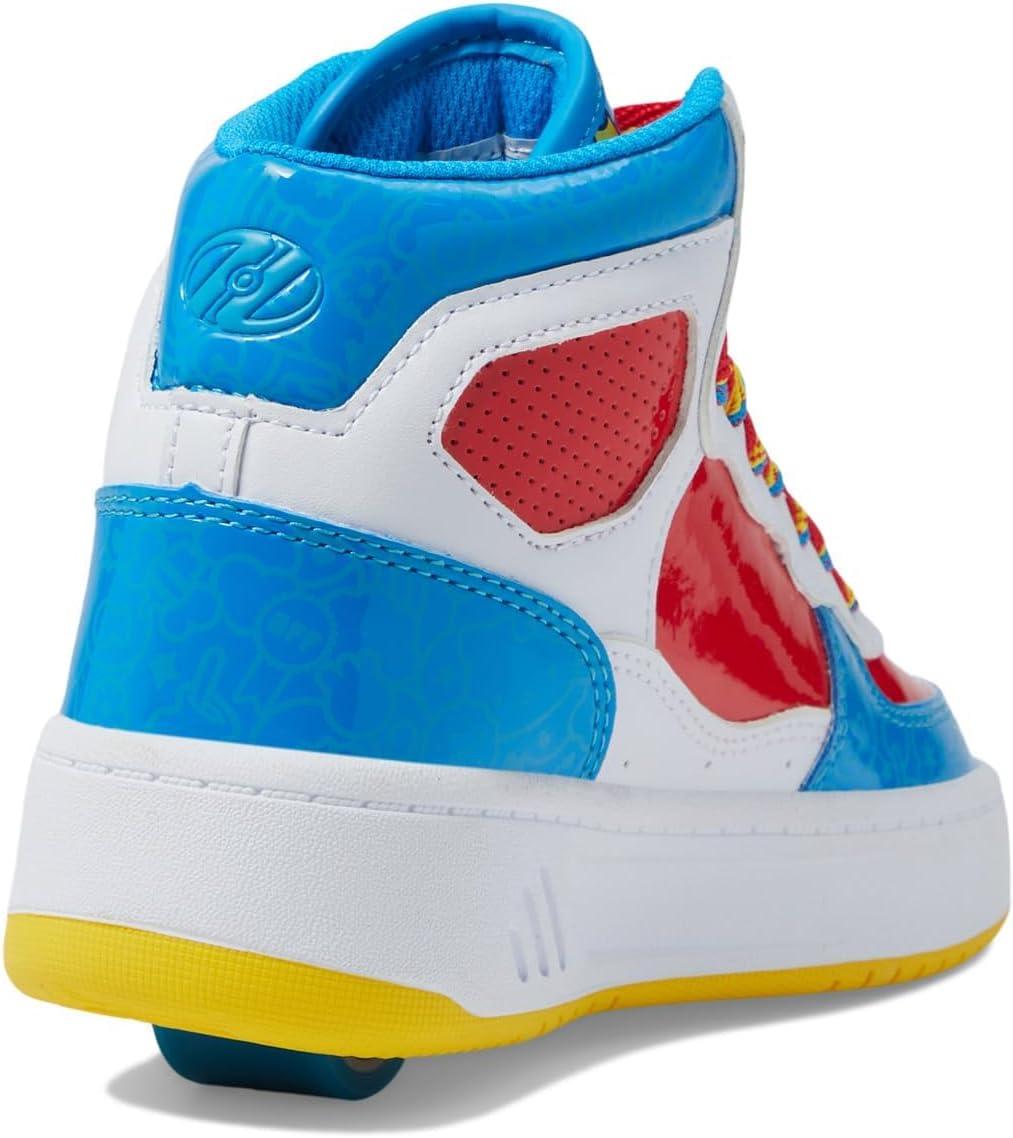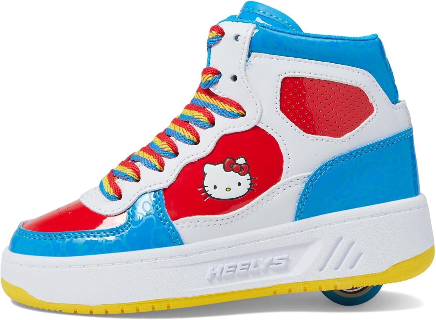 These charming Hello Kitty Heelys are vibrant and captivating! White, red, and blue synthetic upper. Rainbow-colored, long-lasting nylon laces. Padded collar for optimal support and comfort. Low-profile, removable wheels in the heel, equipped with ABEC 5 bearings.