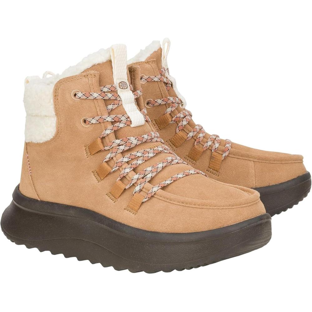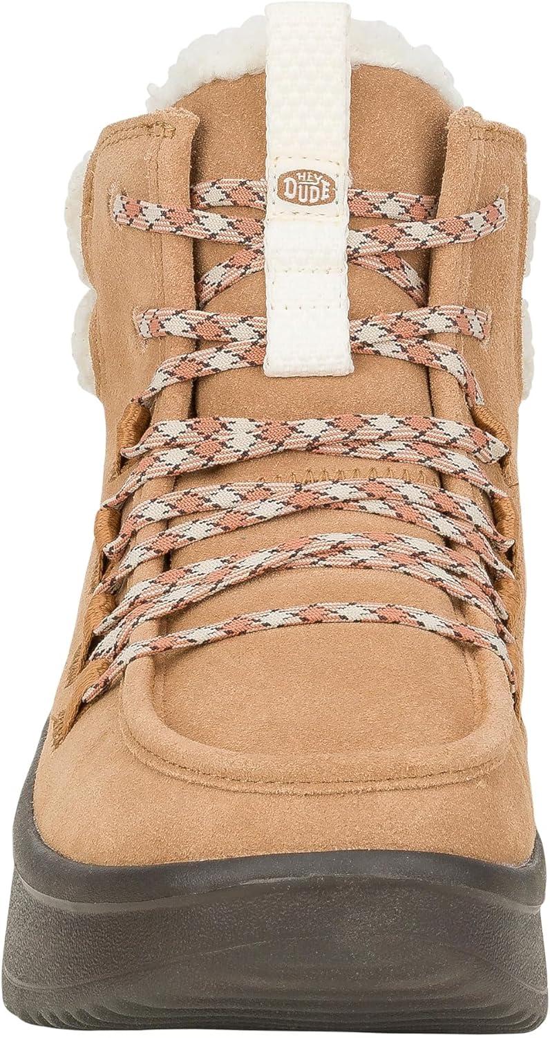 Showcase a sleek, urban finesse wearing the Hey Dude Wendy Peak Apres Suede Cozy Loafers. The mid-top footwear features water-resistant, premium leather upper with fabric lining and snug collar to keep your feet warm. EVA insole. Lace-up closure. Front pull tabs for wearable ease. Platform heel. Flexible rubber outsole.