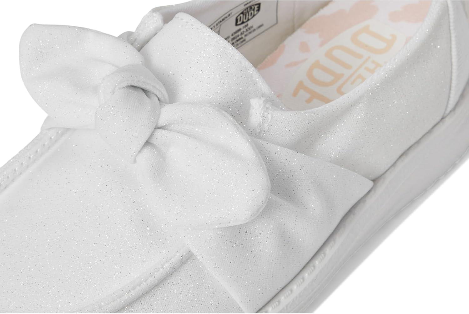 Easy, breezy, textile makes this Hey Dude Kids Wendy Bow Stardust sneaker ready to roam. Easy-on elasticized laces, EVA outsole, and removable insole provide go-to comfort. Wendy provides everywhere comfort, but with a style ideal for women who enjoy life's ever-changing journey. The relaxed look and feel allow you to explore your passions and experience new places with the confidence your feet will fit into any occasion. The removable memory foam cushioned insole provides maximum comfort and reduces sweating and odors. Flex & Fold: This supports healthy feet with its unique shape giving complete freedom of movement. Canvas upper and cotton lining. Slip-on closure. Machine washable friendly (cold). Round toe design.