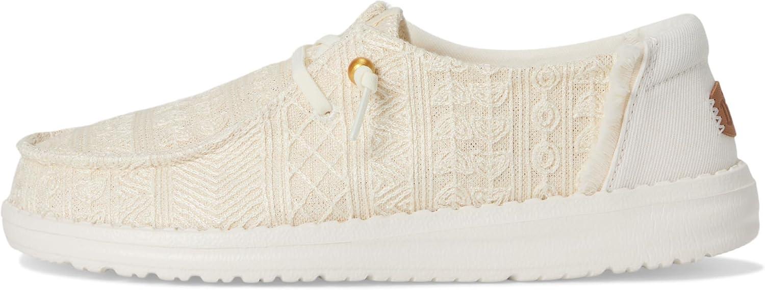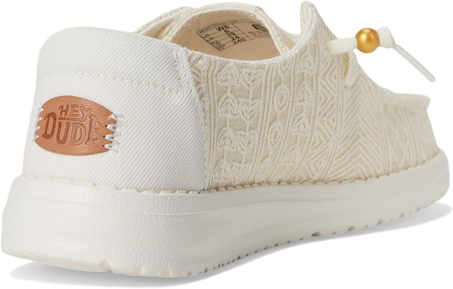 Level up your boho chic choosing the Hey Dude Wendy Crochet Lace sneakers! These stylish go-to's weave together breezy crochet lace with a touch of fringe flair at the heel. Slip-on and go in effortless style, all thanks to our easy-on system and elasticized laces. From strolls on the beach to summer soirees, these kicks will be your new warm-weather bestie. Wendy provides everywhere comfort, but with a style ideal for women who enjoy life's ever-changing journey. The relaxed look and feel allow you to explore your passions and experience new places with the confidence your feet will fit into any occasion. The removable memory foam cushioned insole provides maximum comfort and reduces sweating and odors. Flex & Fold Technology: This supports healthy feet with its unique shape giving complete freedom of movement. Cotton upper and lining. Branding on the back heel tab. Round toe design. Rubber outsole.