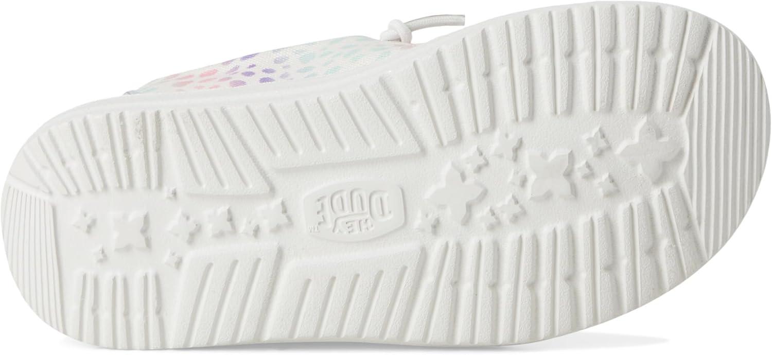 Introducing the playful yet functional Hey Dude Kids Wendy Iridescent Leo slip-on sneakers, designed to accompany your little adventurers through every twist and turn of their day. These vibrant shoes, with their colorful print canvas upper and branded heel tab, are a perfect blend of style and comfort, embodying the spirit of carefree exploration. Imagine your child slipping into these shoes effortlessly, thanks to the easy-on elastic laces that make getting ready a breeze. Whether they're skipping, running, or jumping, the lightweight EVA outsole ensures they stay comfortable and supported, while the removable memory foam cushioned insole provides a soft landing for every step. This insole not only enhances comfort but also minimizes sweating and odors, keeping their feet fresh and ready for any challenge. Crafted with a breathable cotton lining, these shoes ensure that feet remain cool and comfortable, no matter how active the adventure. The unique rounded toe design and Flex & Fold technology support healthy feet, offering complete freedom of movement, ideal for growing kids who need footwear that adapts to their energetic lifestyle. Perfect for school, playgrounds, or family outings, these shoes are tailored for kids who love to explore and parents who value quality. These slip-on sneakers are not just shoes; they are a gateway to endless adventures, making them a versatile addition to your child's wardrobe. Designed for both little kids and big kids, they cater to a wide age range, ensuring every child can experience the joy of Hey Dude's innovative footwear. Elevate your child's shoe game with these iridescent wonders, where style meets functionality, providing the ultimate shoe experience for adventurous souls.