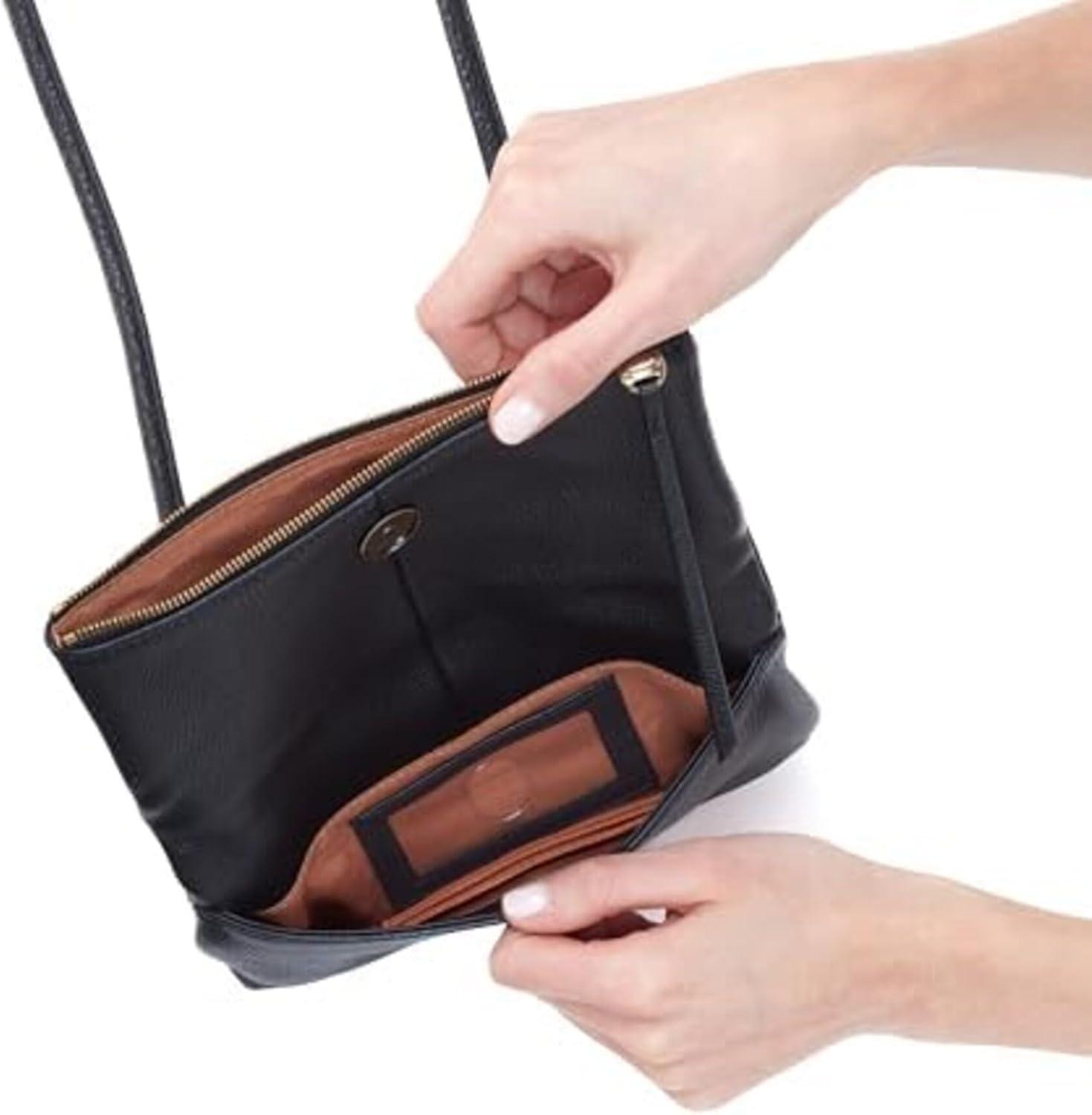 Simplify your carry game with the sleek yet functional Hobo Grant Small Crossbody. It features one main compartment with zippered closure and magnetic snap flap, three interior credit card slots, and an ID window to ease identification hustles. Leather construction. Exterior front zippered pocket on flap. Exterior back signature phone pocket. Cotton lining.