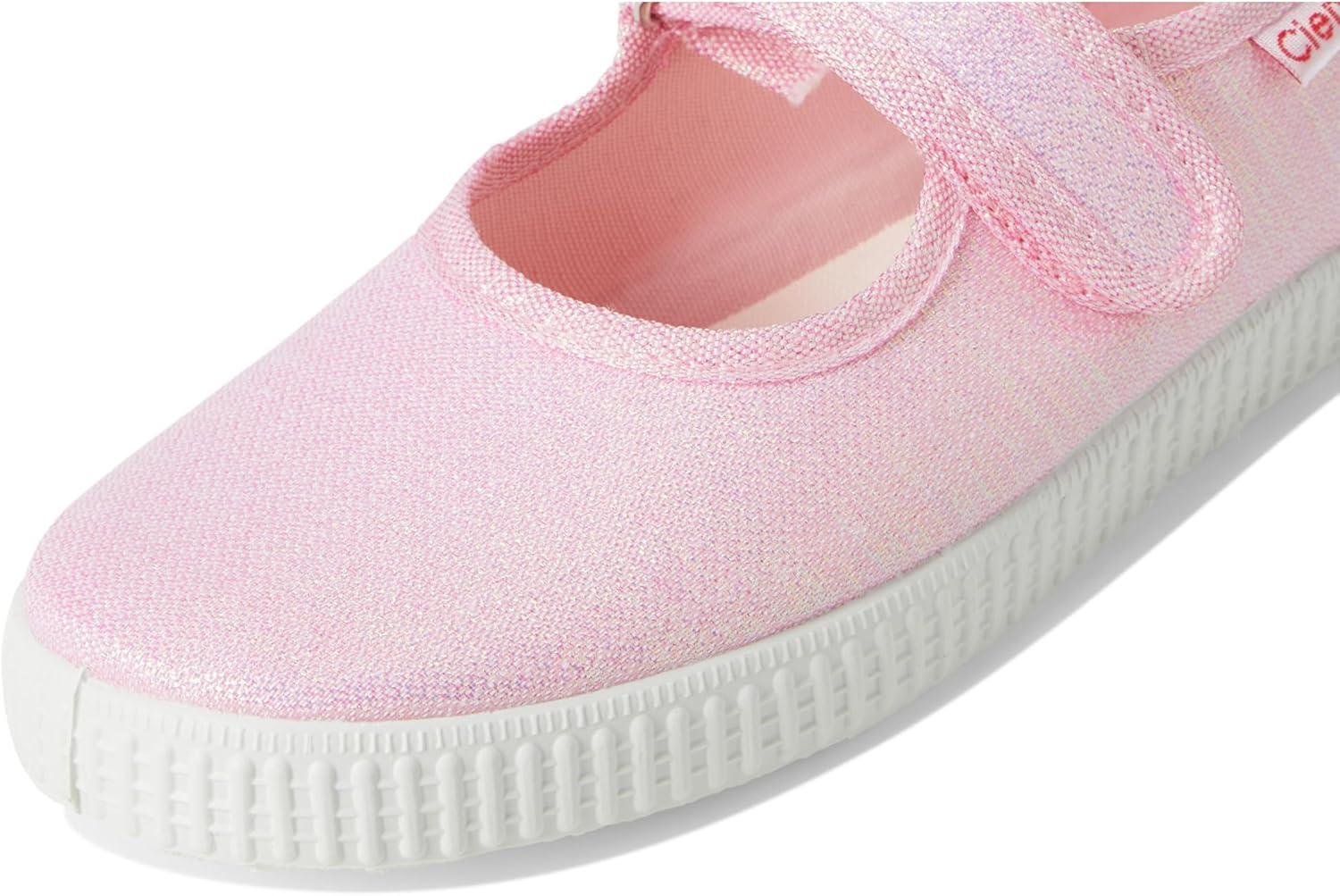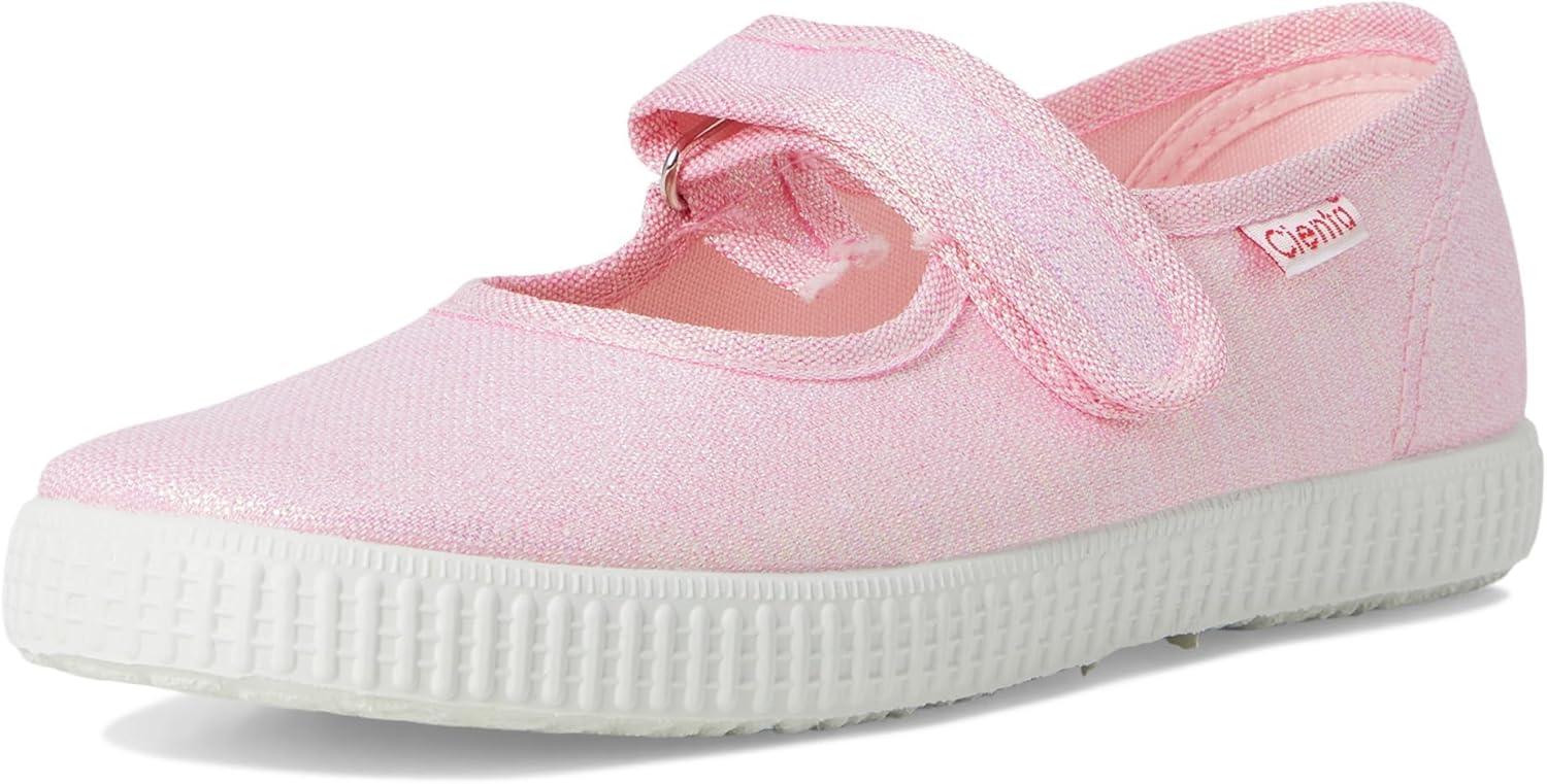 Add some sparkle to her day with the adorable and functional Cienta Kids Shoes 56083 Mary Jane sneakers. Made from a metallic textile upper with a single adjustable hook-and-loop strap closure. Textile lining and a cushioned textile footbed with a removable insole. Durable rubber outsole. Made in Spain.