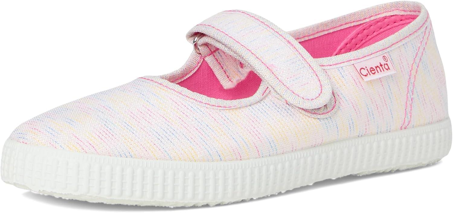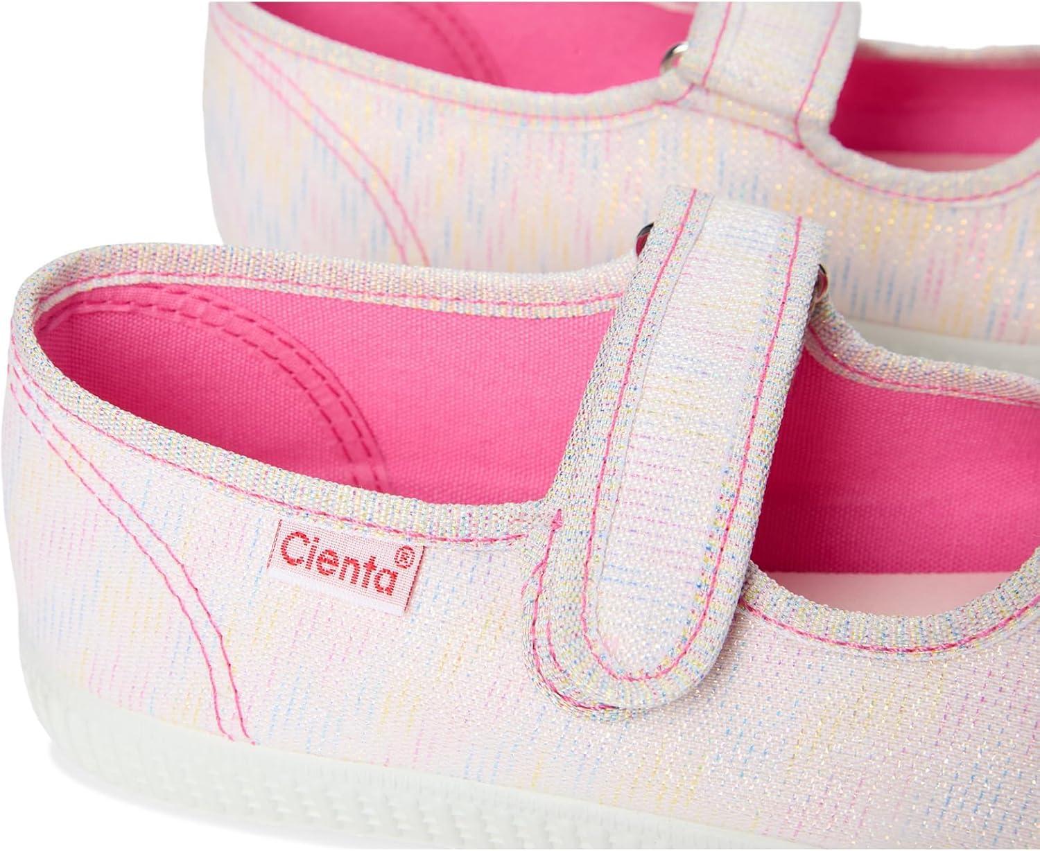 Add some sparkle to her day with the adorable and functional Cienta Kids Shoes 56083 Mary Jane sneakers. Made from a metallic textile upper with a single adjustable hook-and-loop strap closure. Textile lining and a cushioned textile footbed with a removable insole. Durable rubber outsole. Made in Spain.