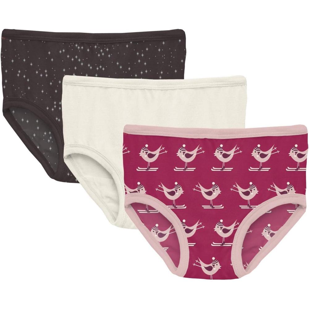 KicKee Girls Underwear, Set of 3, Prints and Solid Colors, Soft Girl Panties, Toddler to Big Kid, All Day Wear(Midnight Foil Constellations Natural & Berry Ski Birds)