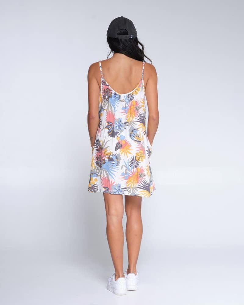 Salty crew desert island dress 31 1/2″ length 100% viscose. Loose fit cami dress with shirring at front and back opening. Inseam pockets, adjustable cami straps and salty crew branding at back opening.