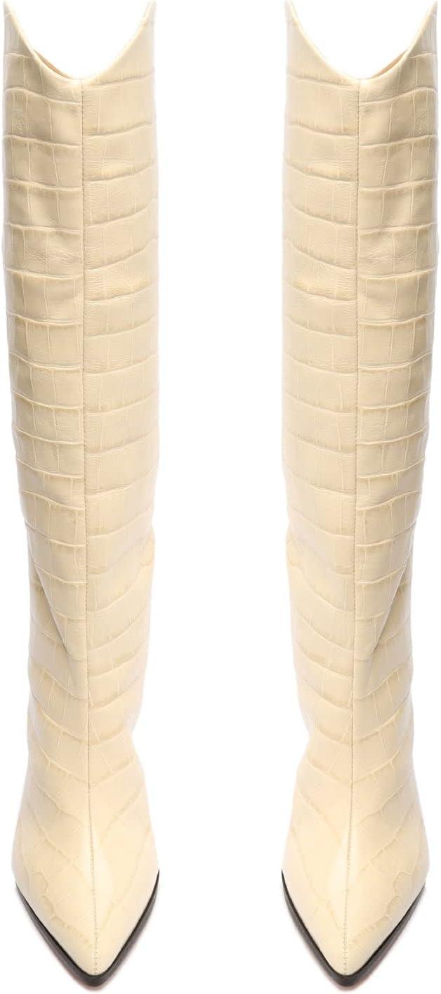 The Maryana Block is a knee-high silhouette crafted from Crocodile-Embossed Leather with a chunky stacked heel. This versatile slip-on style features a flattering almond-shaped toe and complements daytime and evening outfits with a chic sensibility. The Schutz woman will wear hers with a flowy midi dress or a pleated skirt. Boot Materials: Crocodile Embossed Leather | Cow leather lining | Cow leather outsole Upper format: Plain upper Rubber patch at the heel. Heel Type: Mid heel Heel Style: Block Closure Type: Zip closure Toe Style: Round toe Counter Type: Closed Shaft Circumference: 16.4in | 410mm Shaft Height: 13.6in | 340mm Heel Height: 3.3in | 85mm SKU: S2013200680047