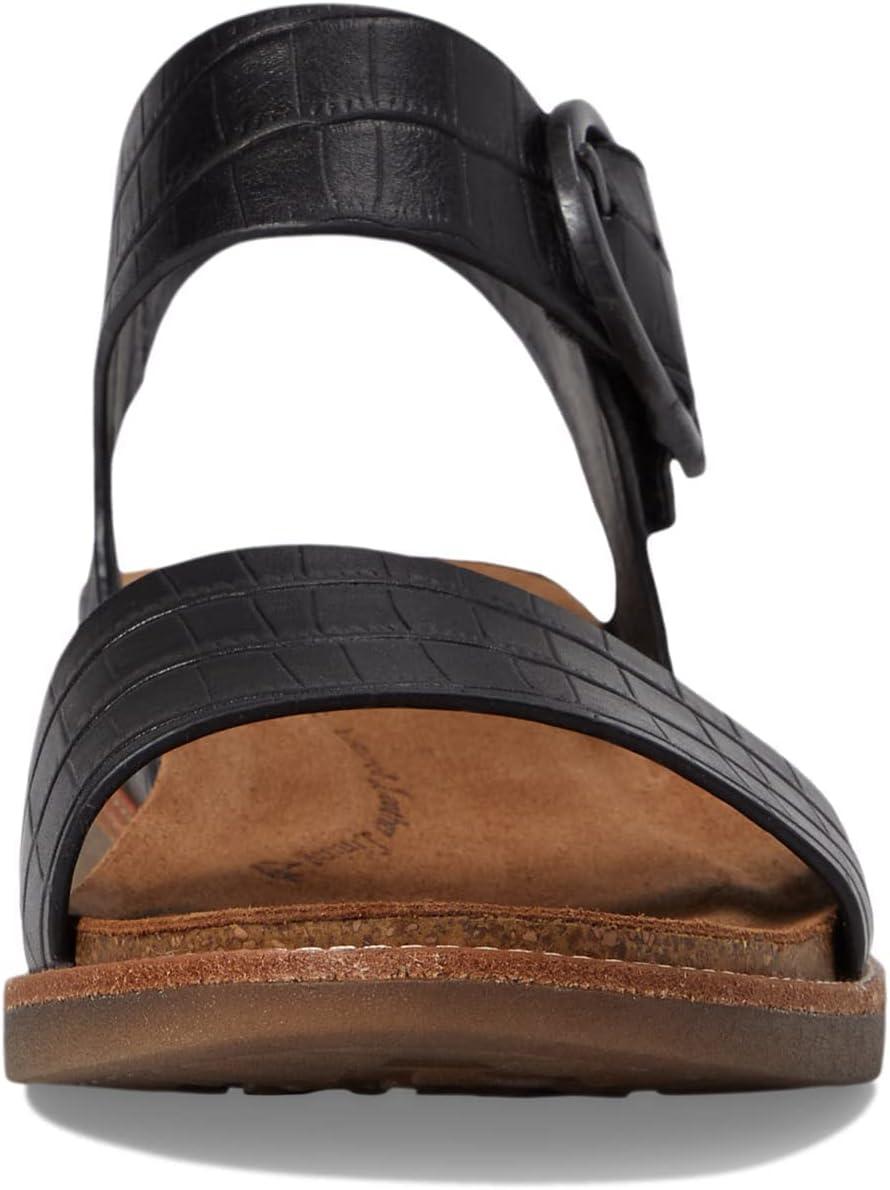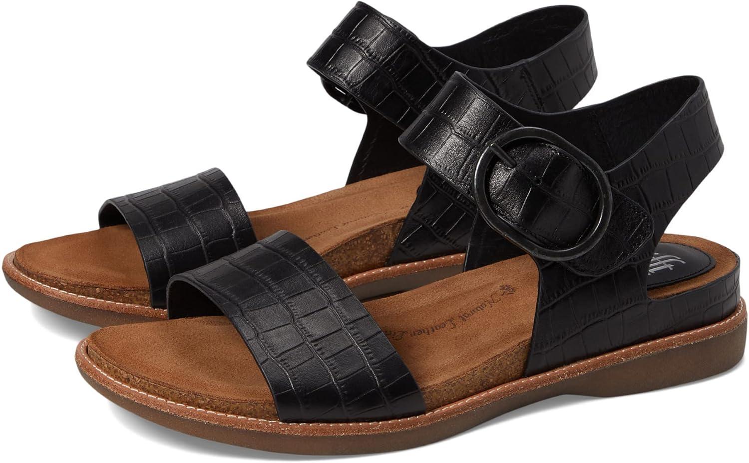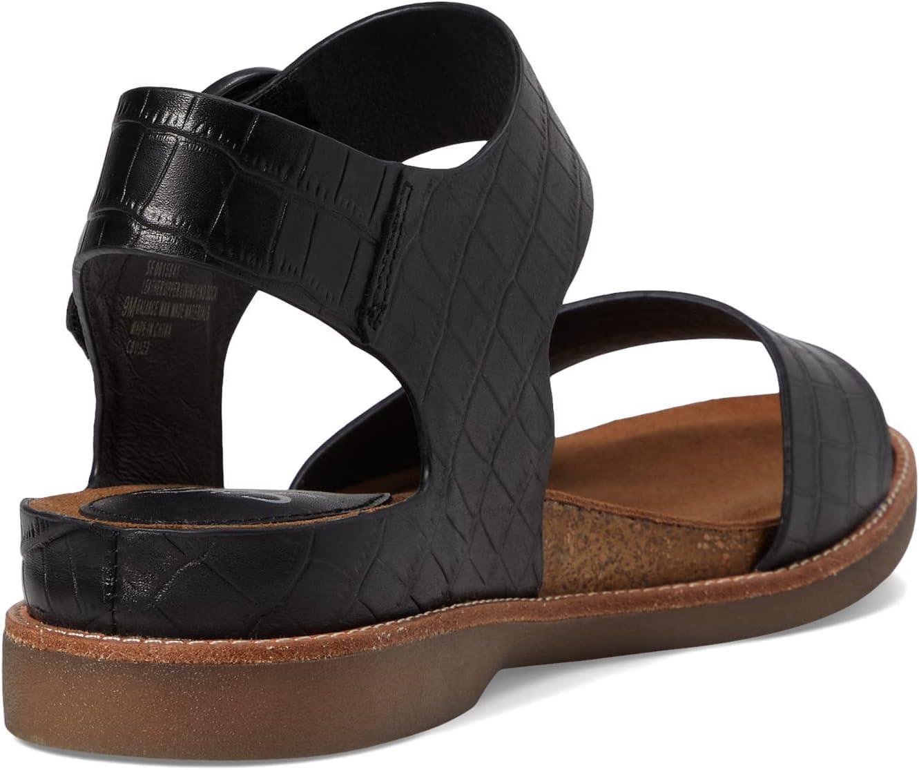 Two piece comfort sandal, hidden hook and loop closure under buckle, padded cork footbed, flexible outsole.