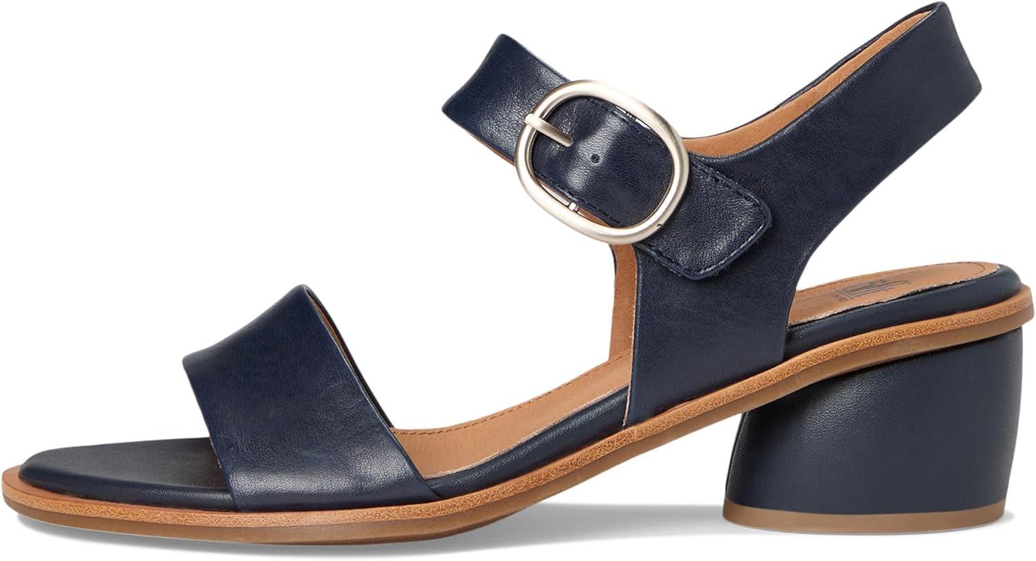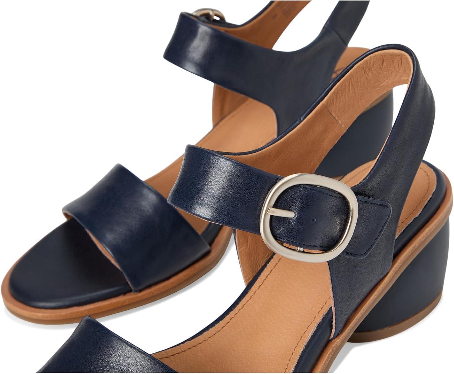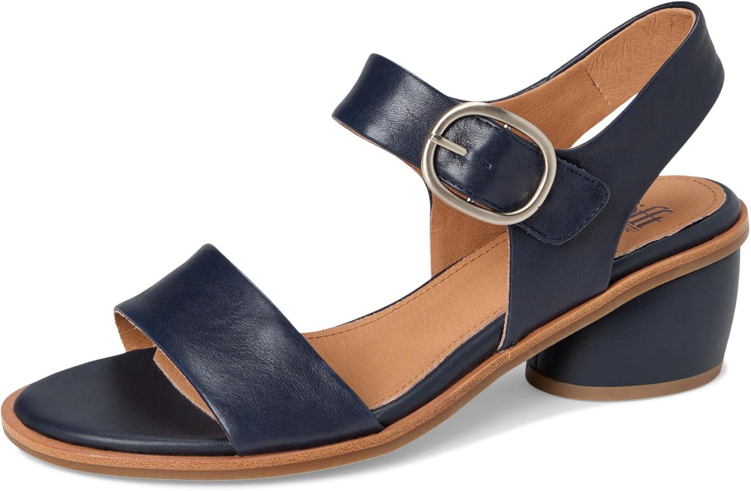 two piece leather dress sandal, hidden hook and loop closure under buckle, leather lining and sock, flexible outsole, wrapped heel, rounded heel