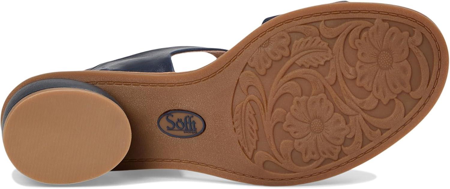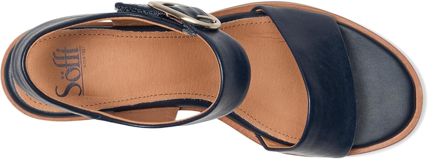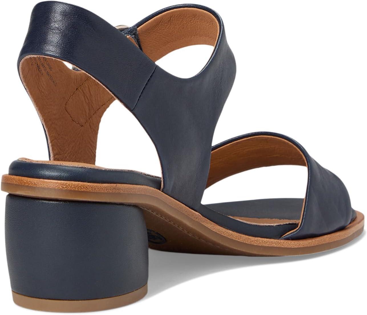 two piece leather dress sandal, hidden hook and loop closure under buckle, leather lining and sock, flexible outsole, wrapped heel, rounded heel