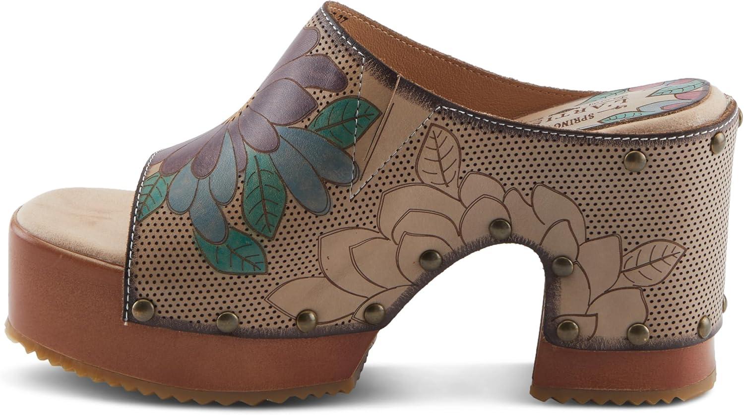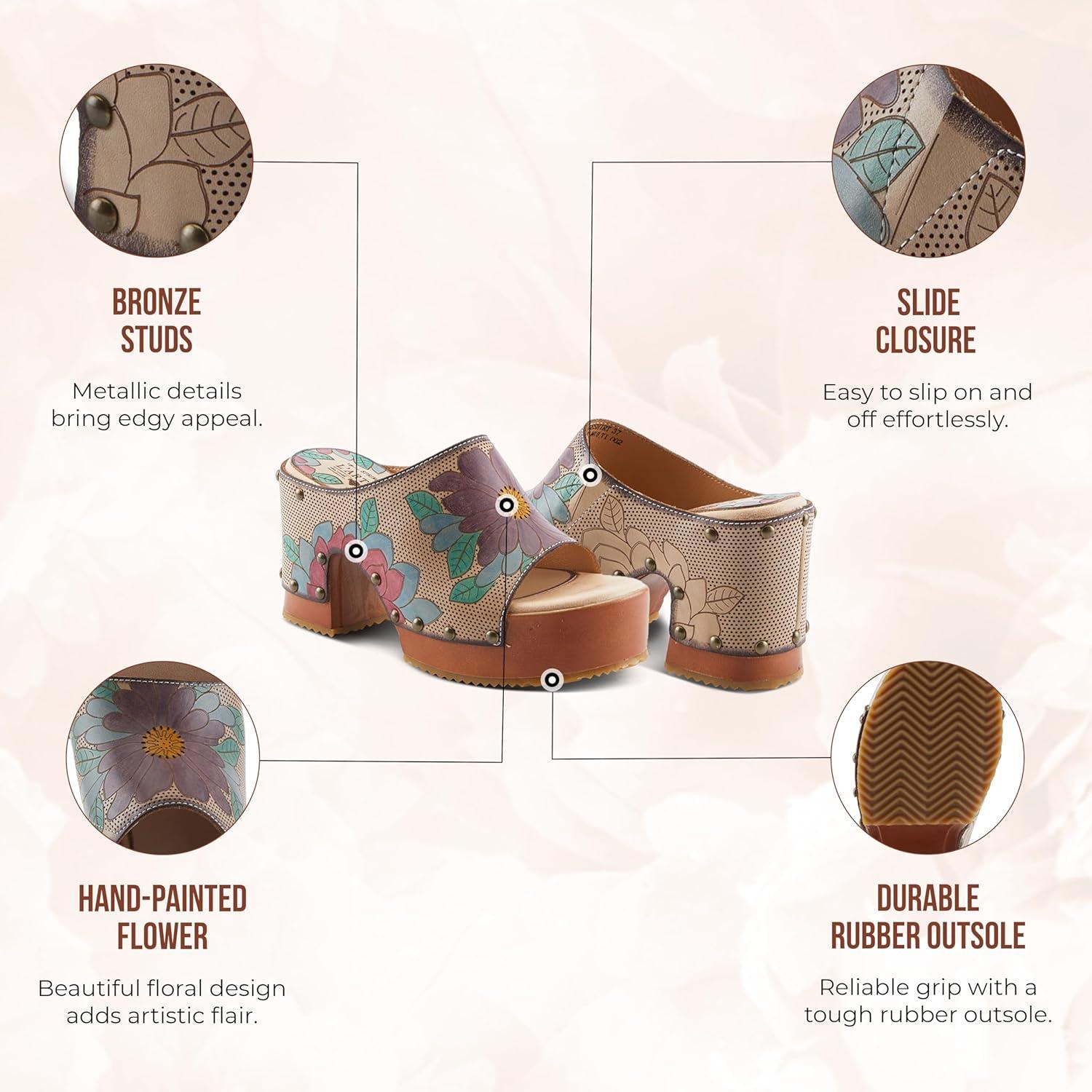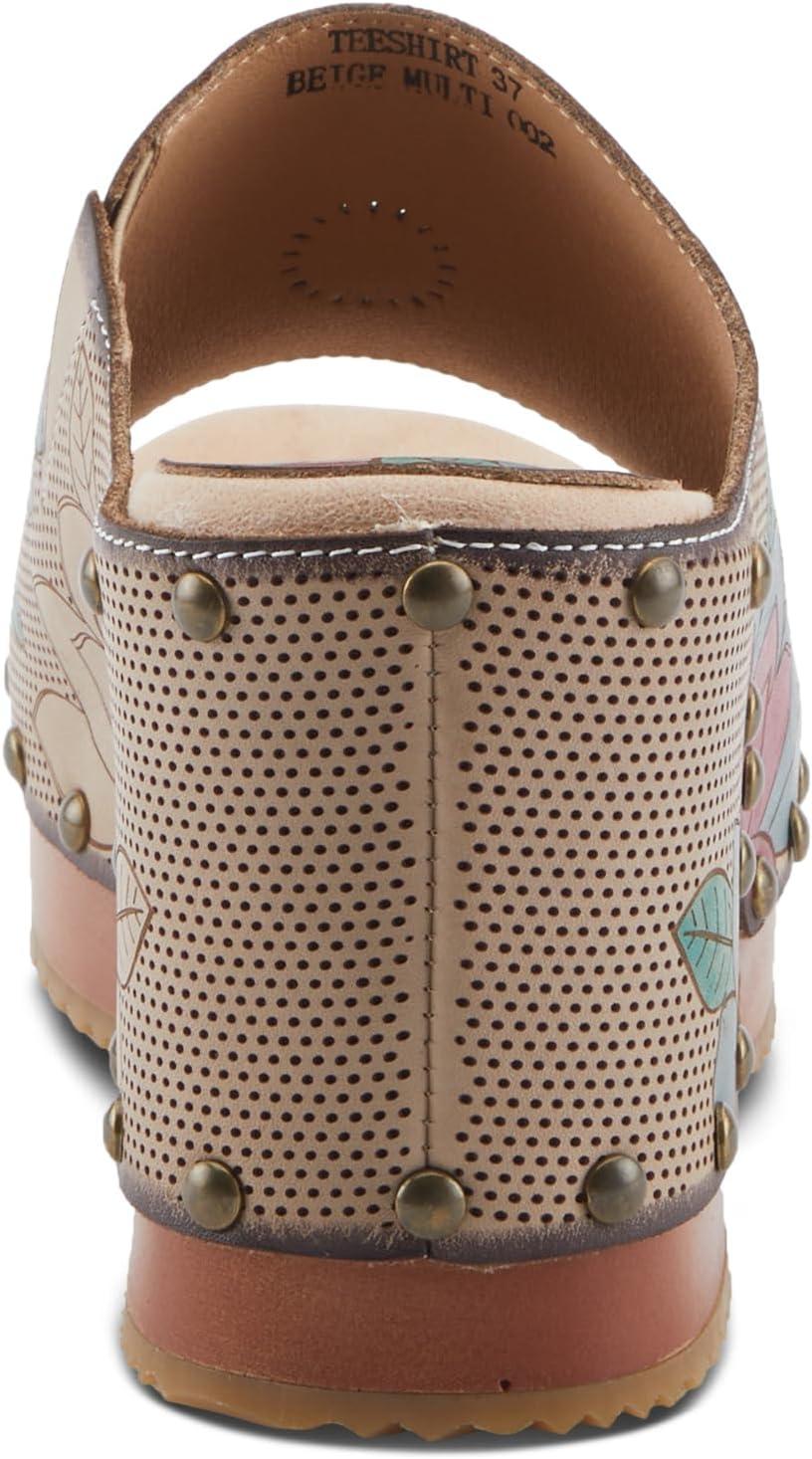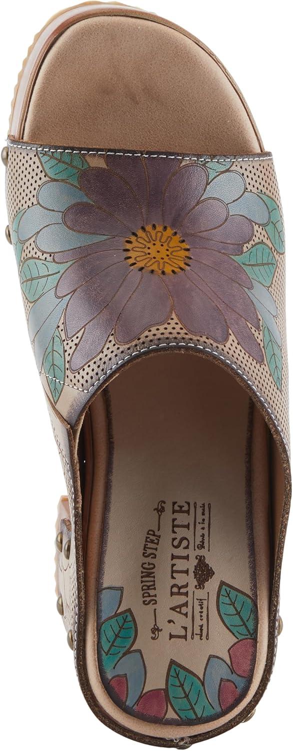 Spring Step L’artiste Teeshirt Women’s Sandals – Handpainted Leather Slides, Retro Floral Design, Cushioned Footbed, Slip-On(Beige Multi)