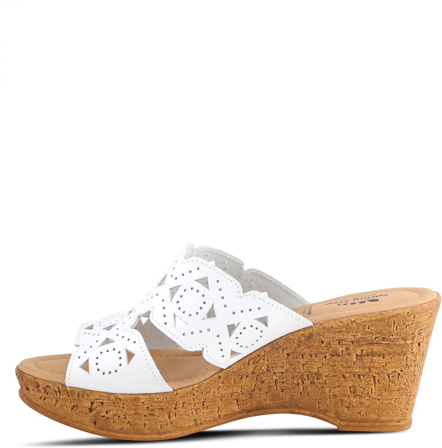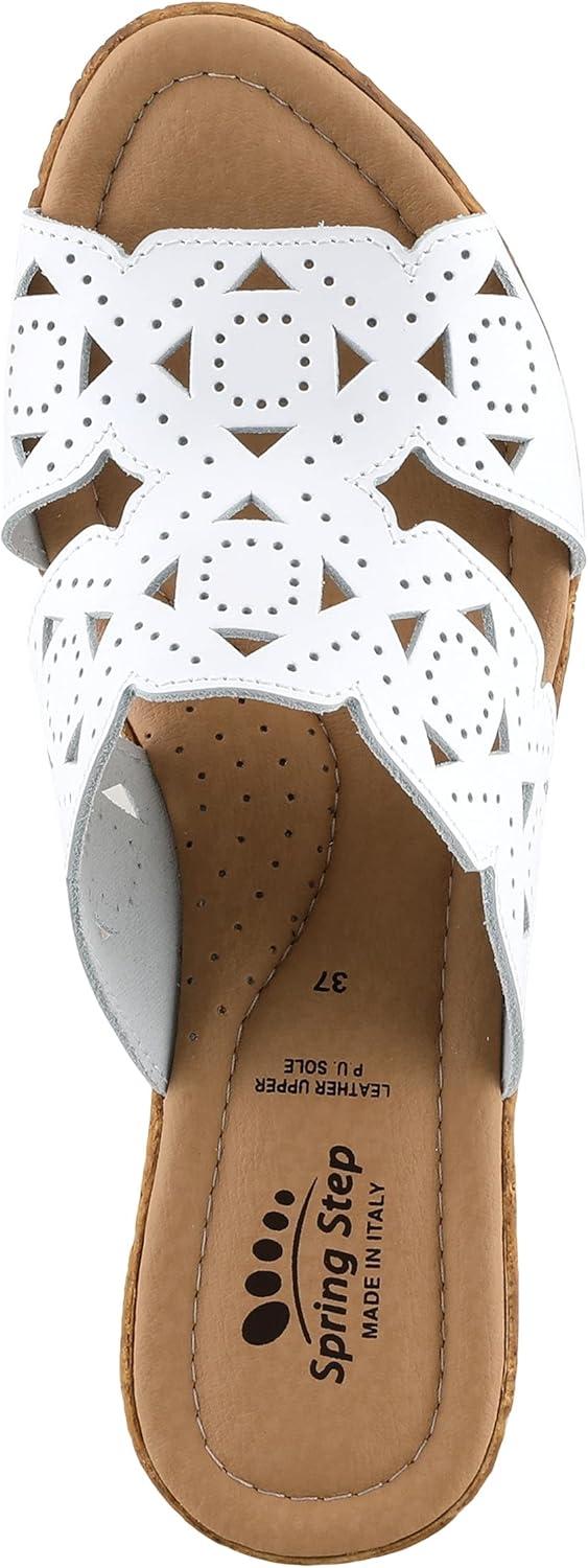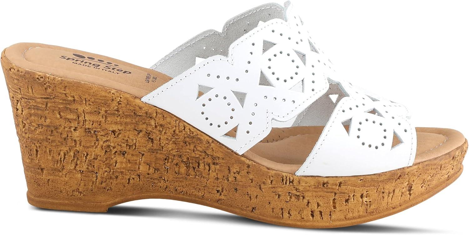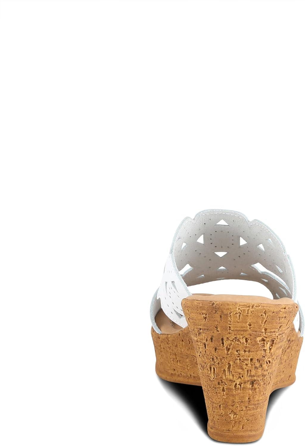 A beautiful Italian rich, subtle leather slide sandal featuring a modern geometric cut out design on a lightweight cork-inspired textured wedge