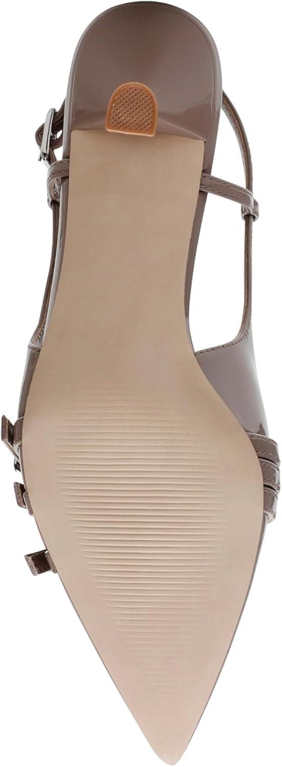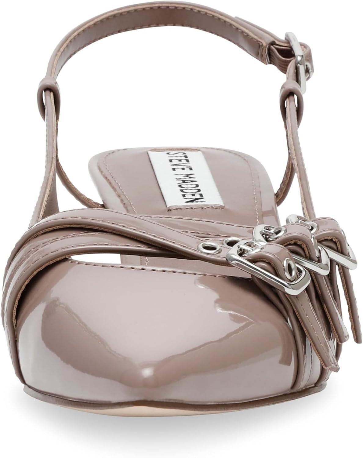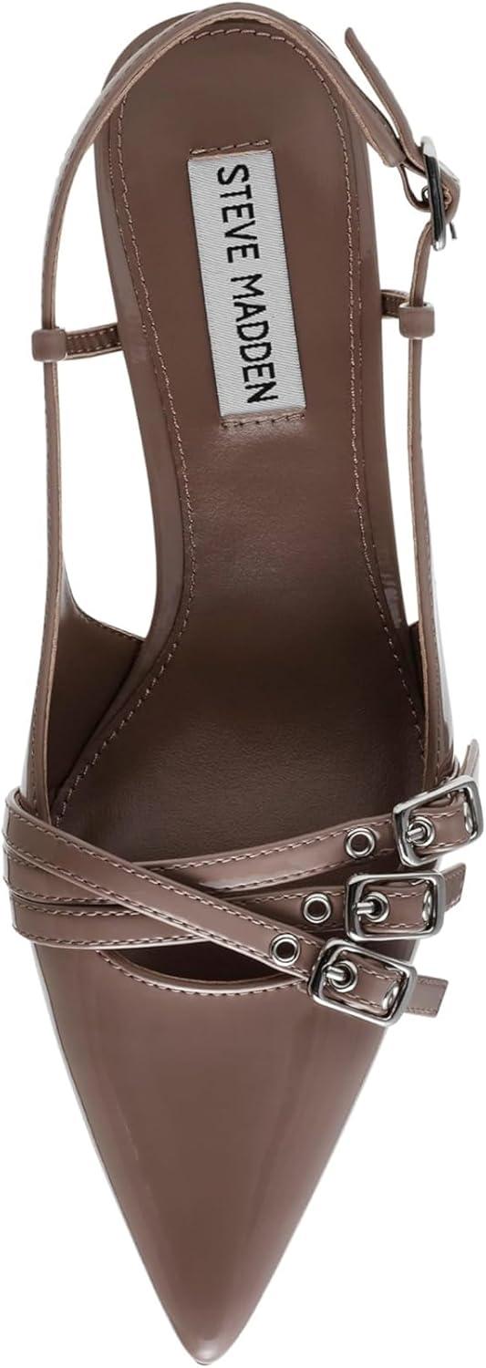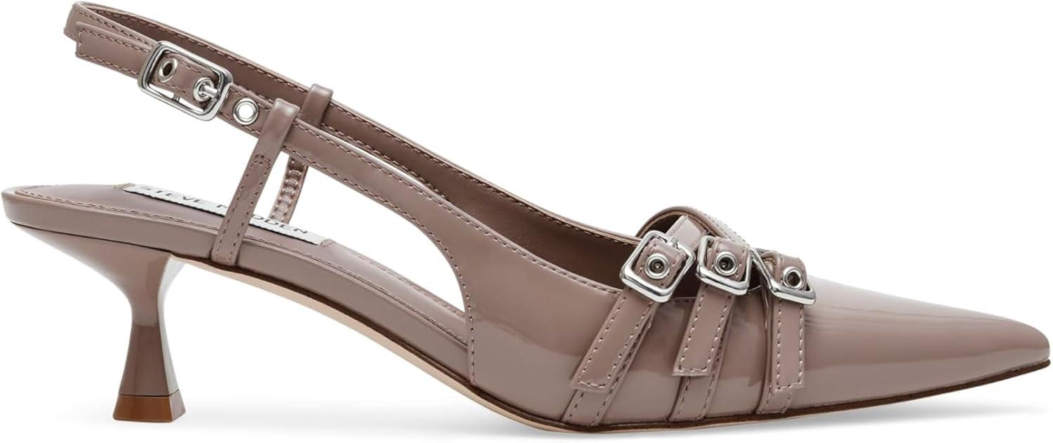 Sleek and chic, the LOCA slingback pump is set on a clever kitten heel with decorative buckle straps over the point toe. These open-back Steve Madden heels pair with office looks perfectly and add a touch of sophistication to casual styles.