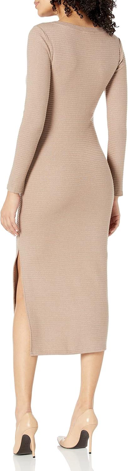 The Love Shrug is a rib ponte knit midi dress. Details make this dress, thanks to its peekaboo cut-out at the chest, subtle slits on the sides, and bateau neckline.