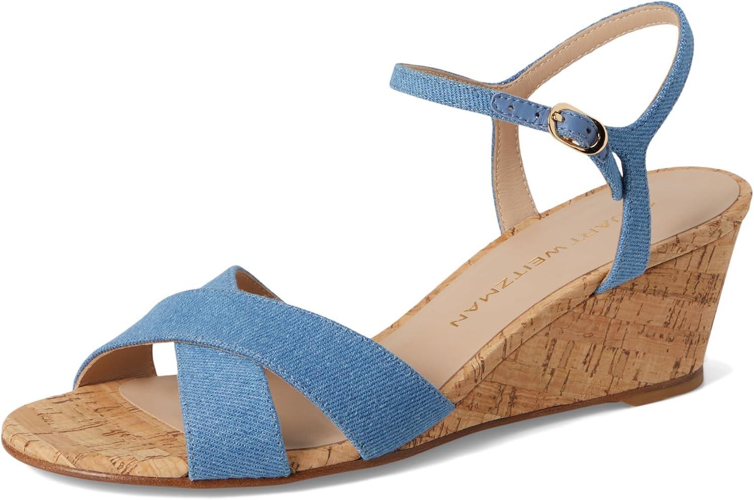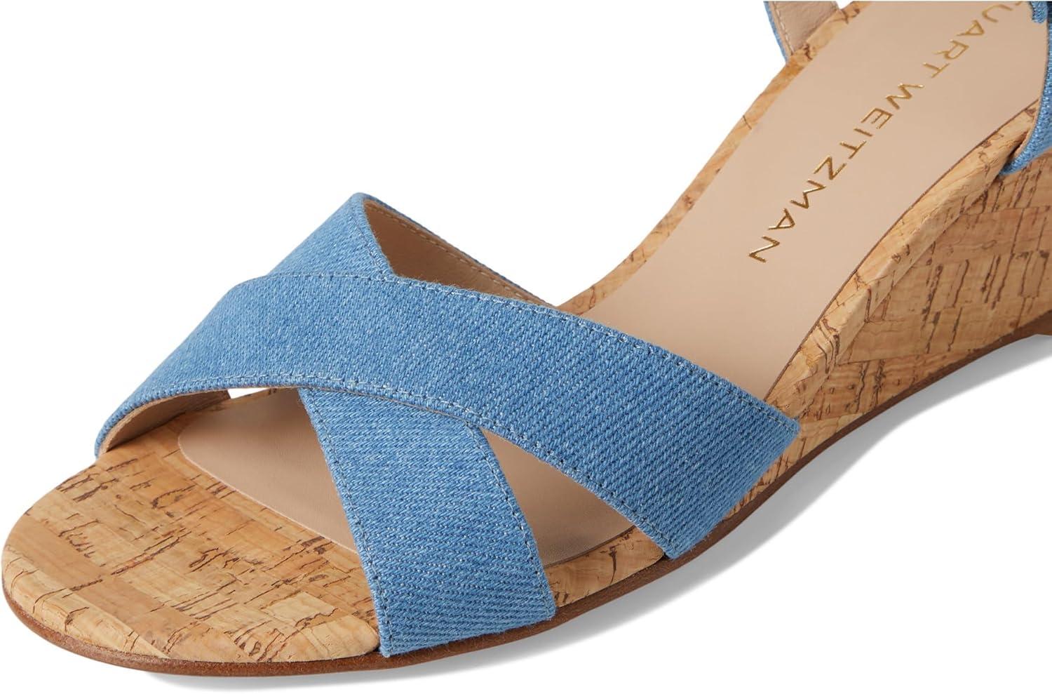Make a statement choosing the Stuart Weitzman Dayna Demi Wedge heels. Crafted with stylish denim upper and luxe mestizo leather lining, these sandals are both fashionable and versatile. The leather insole offers premium comfort, while the open toe design adds a playful touch. Complete with wedge heels, these sandals will effortlessly elevate your look. Ankle strap with buckle closure. Leather outsole. Made in Spain.