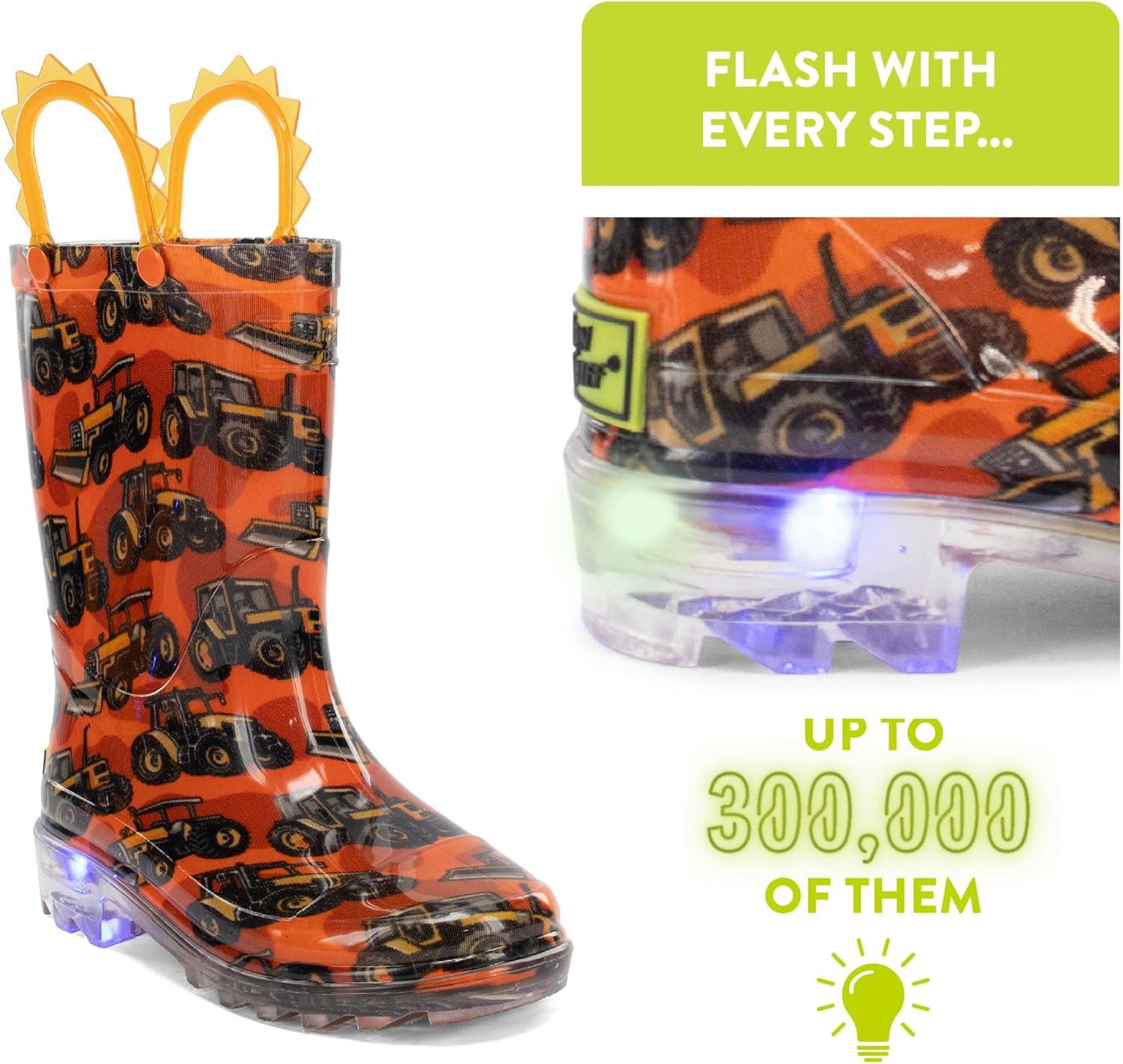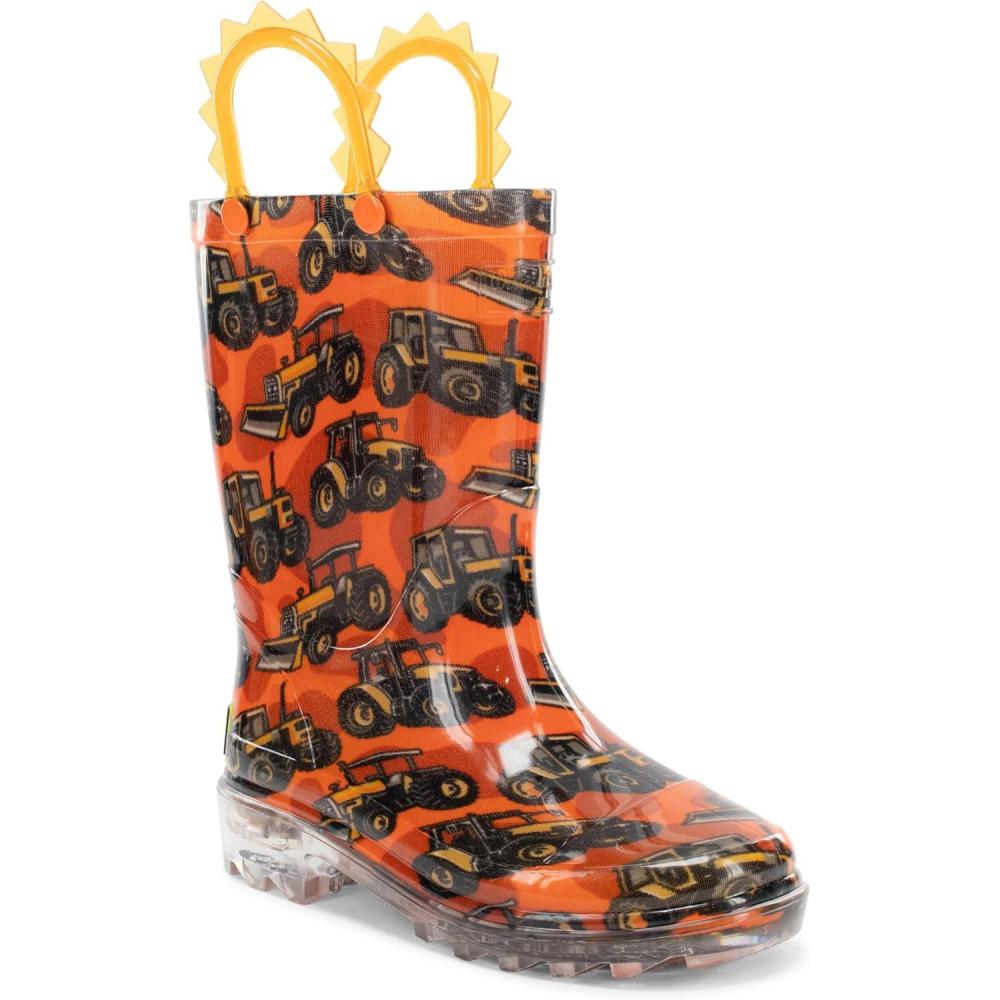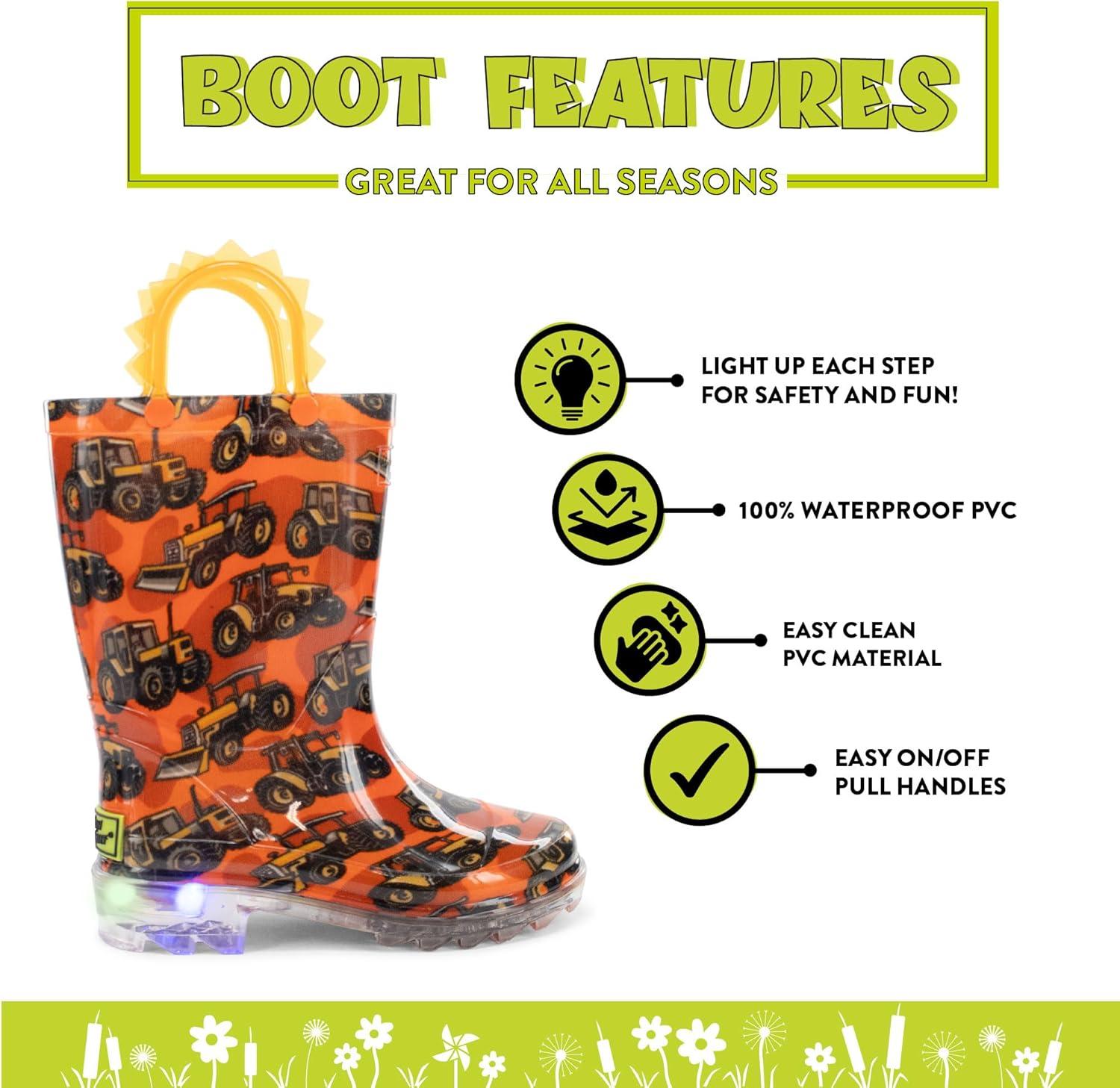 Western Chief Kids Waterproof Light Up Rain Boots With Handles for Easy On and Off for Boys and Girls(Tractors)