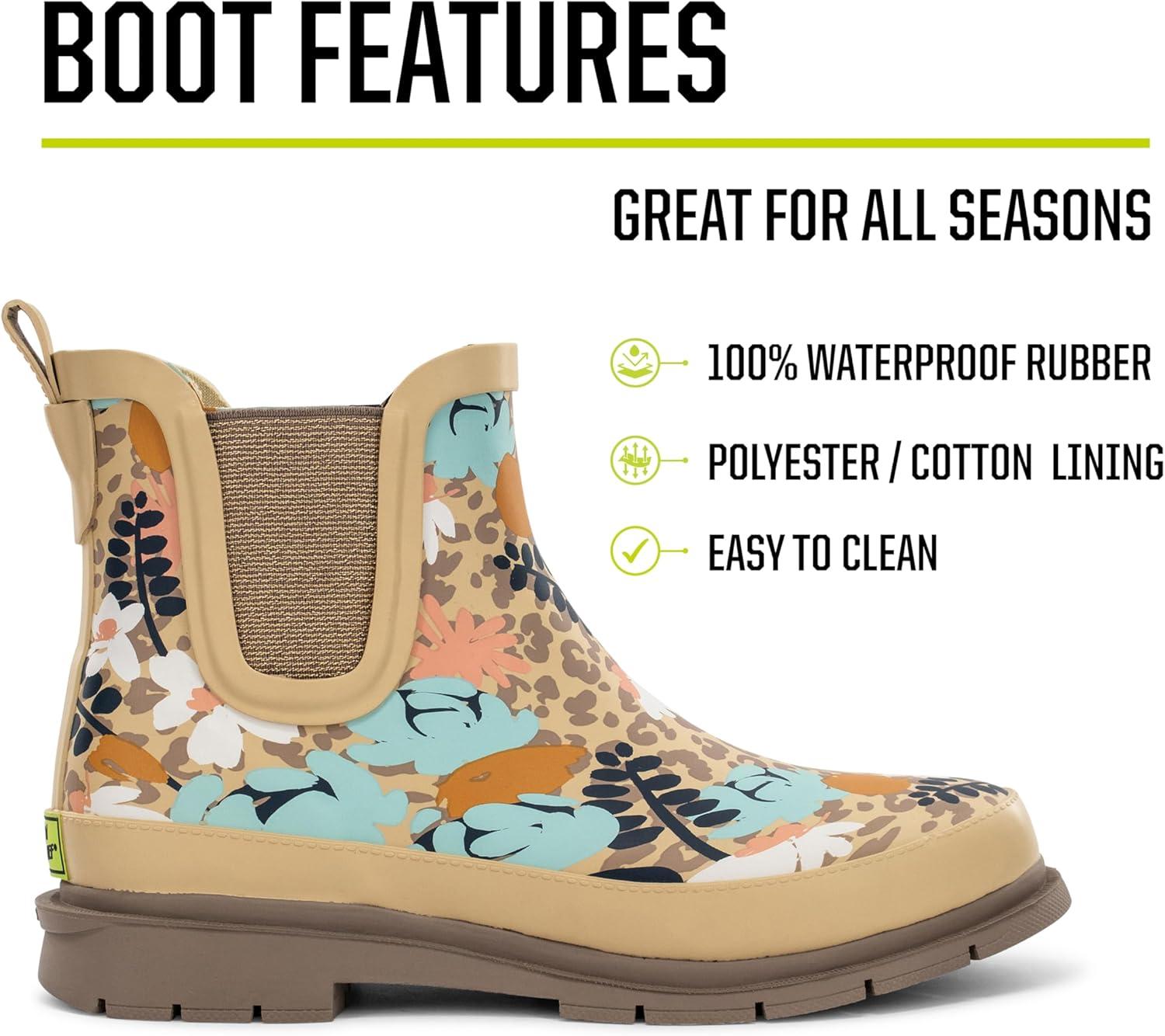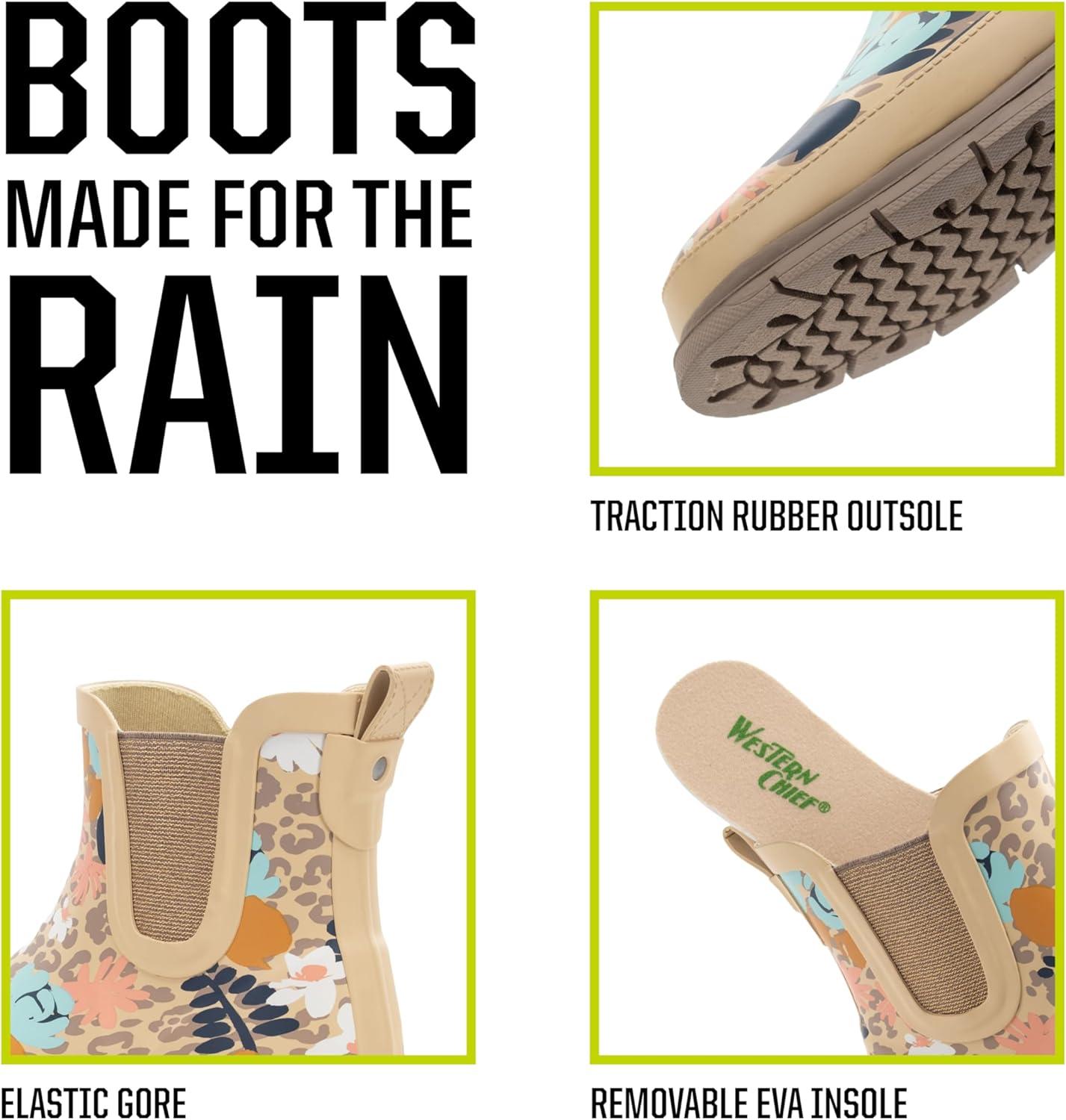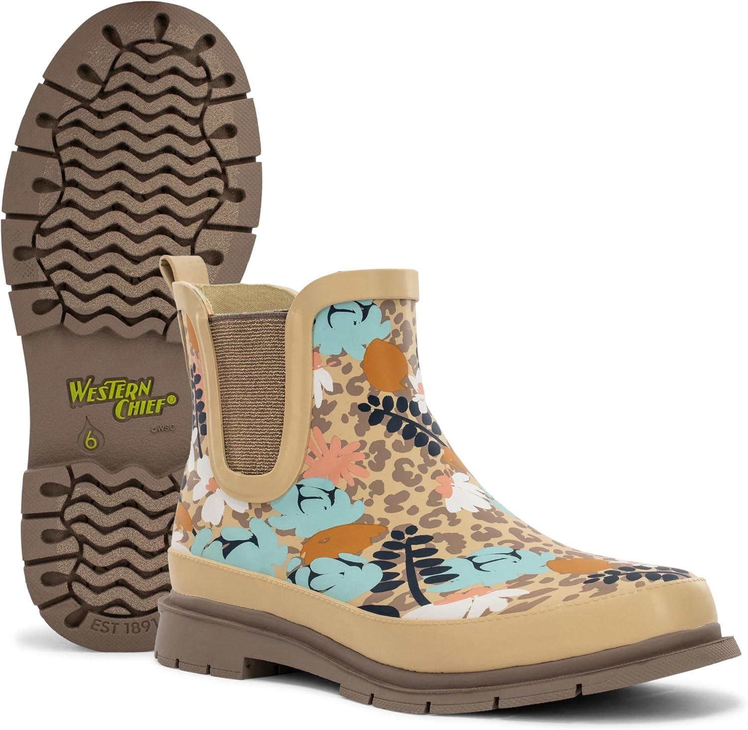 Western Chief Women’s Waterproof Chelsea Ankle Rain Boot with Elastic Gore and Rubber Lug Outsole – Stylish and Functional for Rainy Days(Leopard Floral)