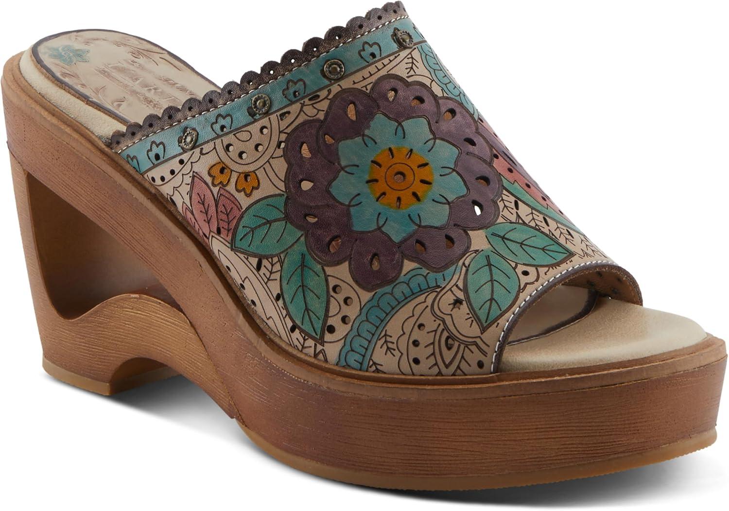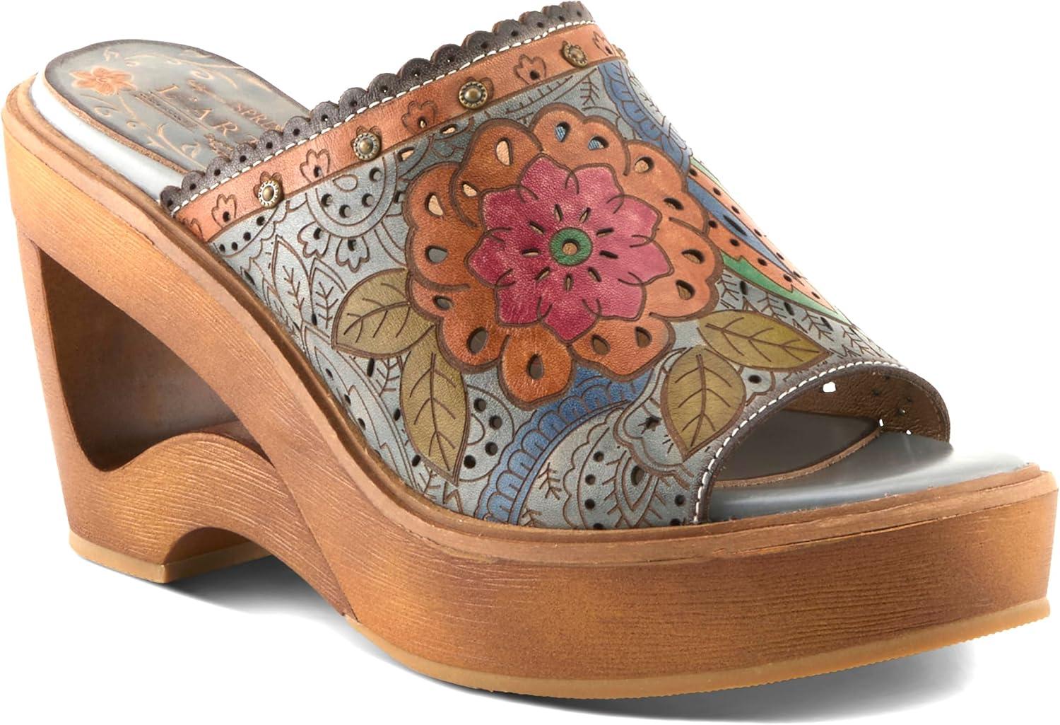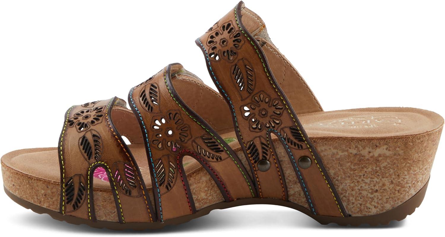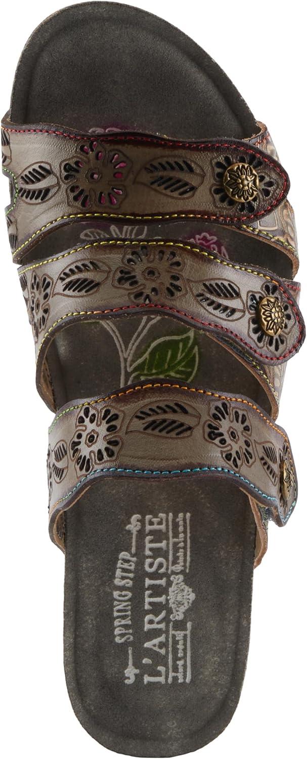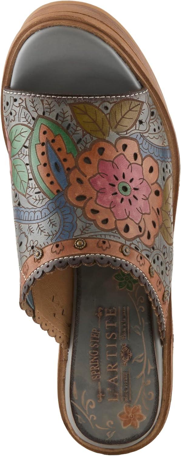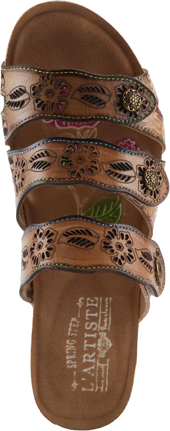 Spring Step L’artiste Teeshirt Women’s Sandals – Handpainted Leather Slides, Retro Floral Design, Cushioned Footbed, Slip-On(Brown Multi)