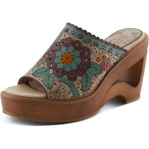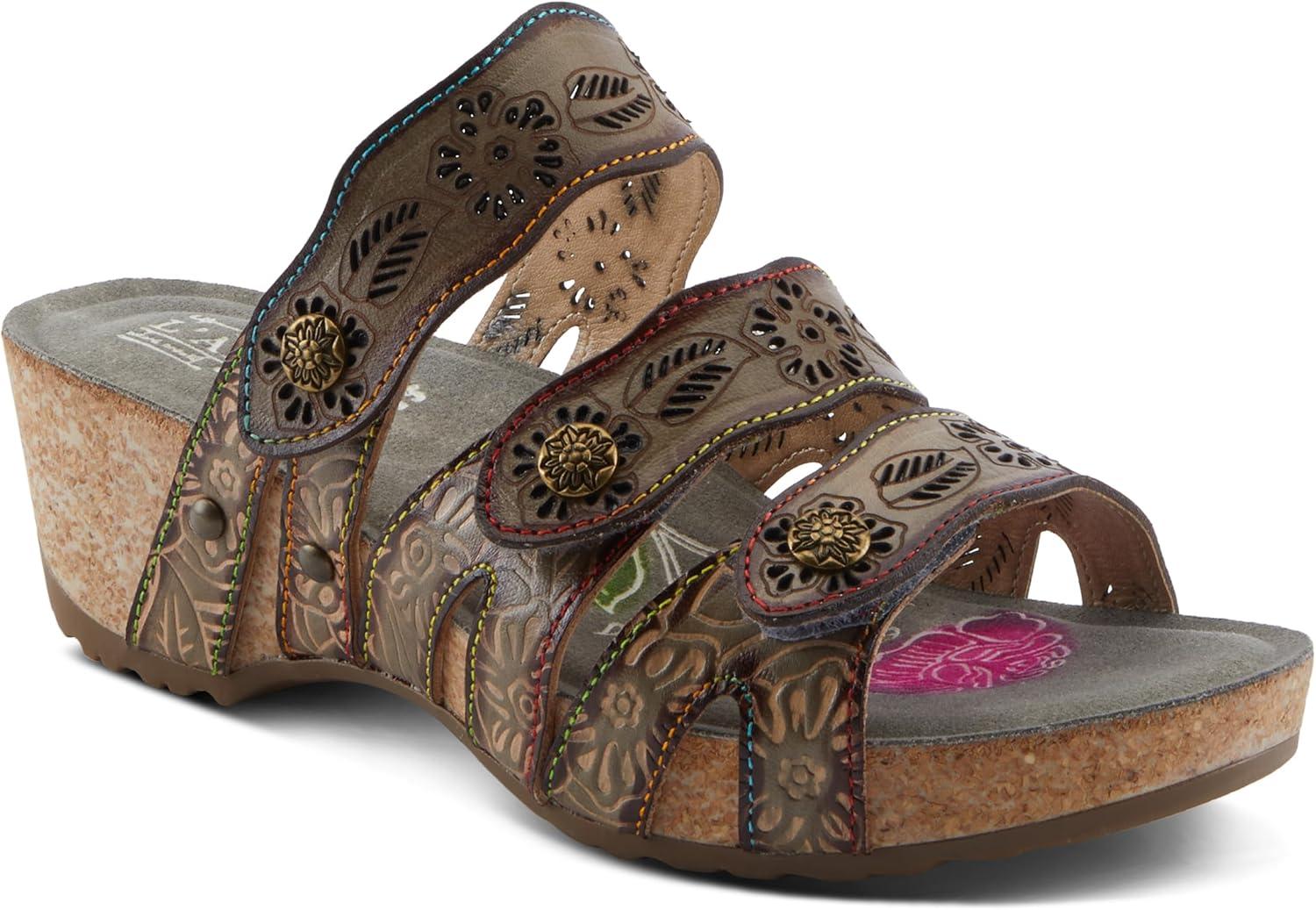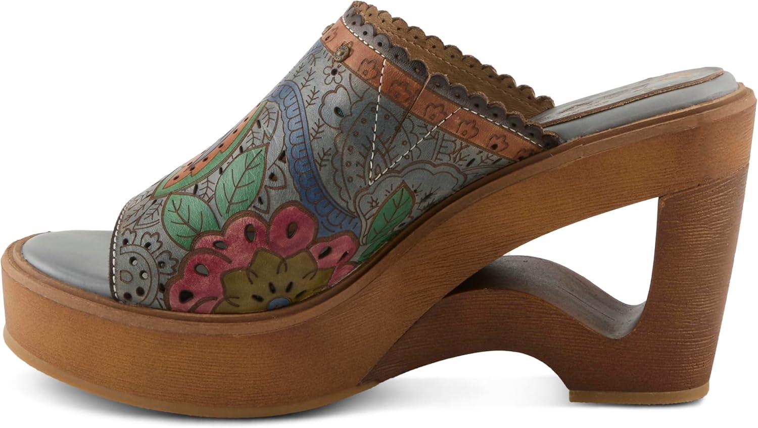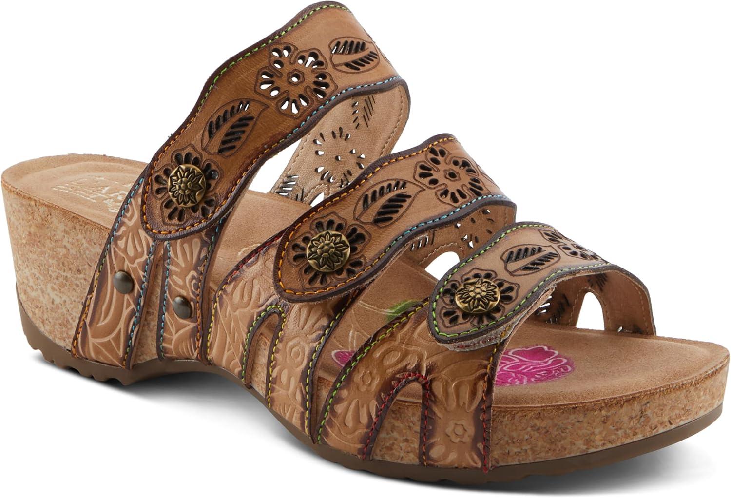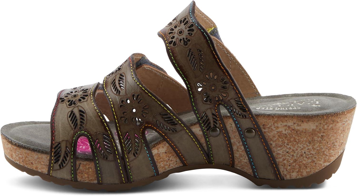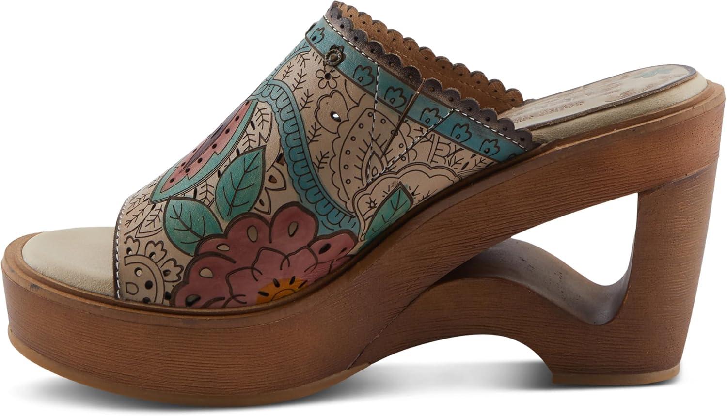 Spring Step L’artiste Teeshirt Women’s Sandals – Handpainted Leather Slides, Retro Floral Design, Cushioned Footbed, Slip-On(Brown Multi)